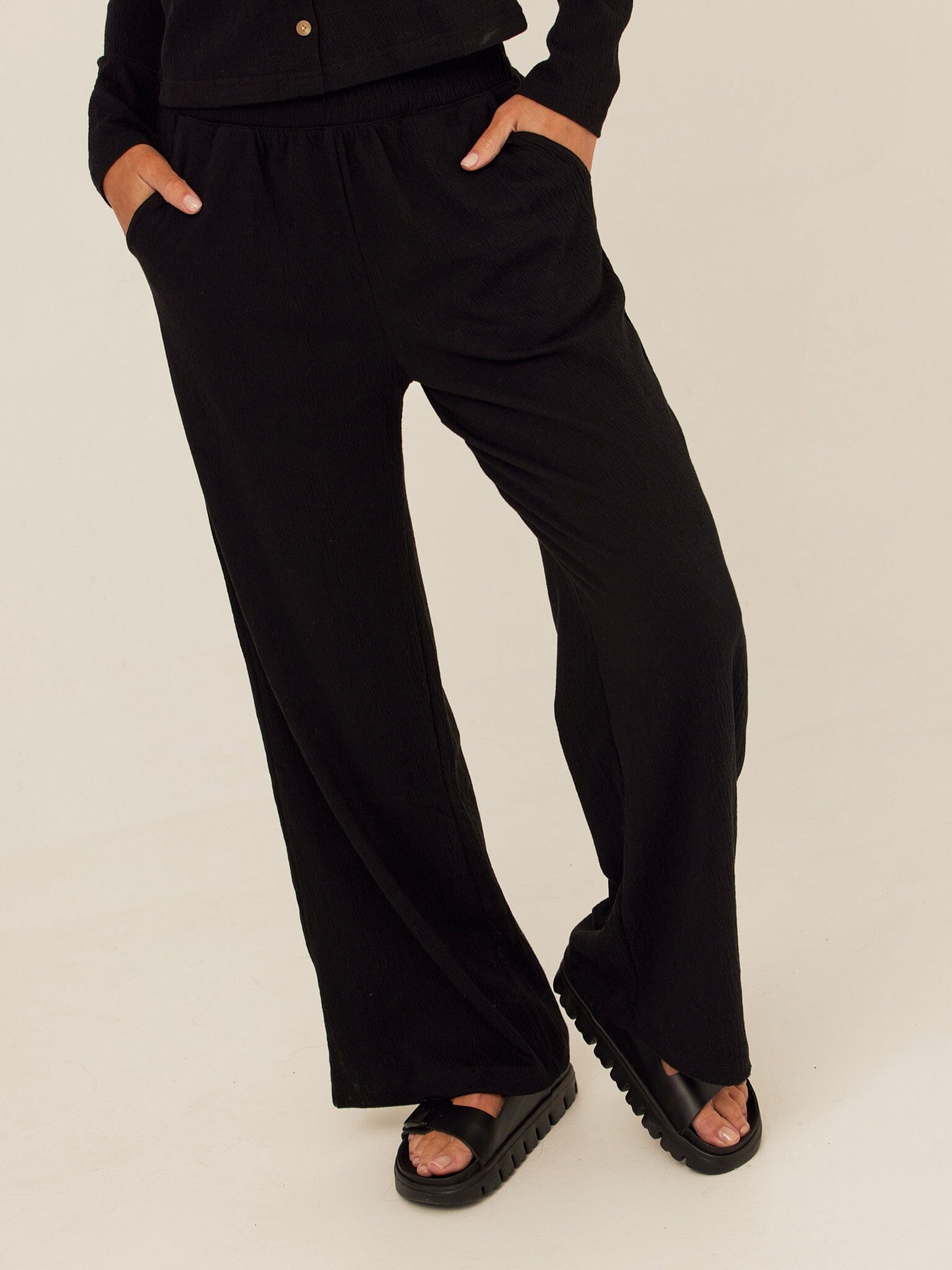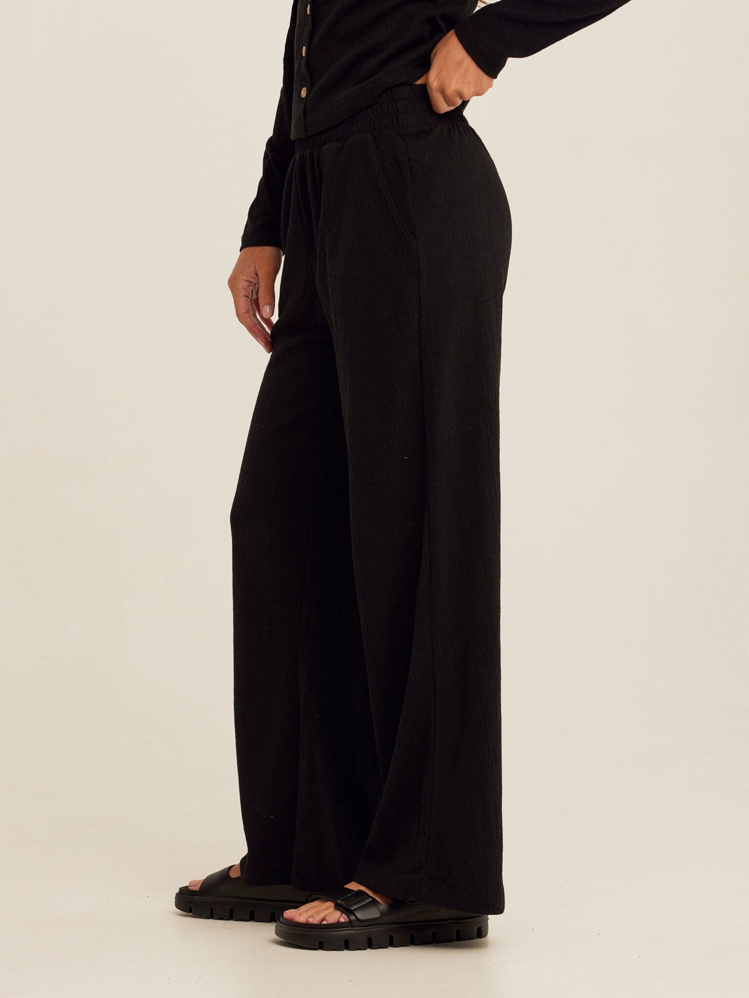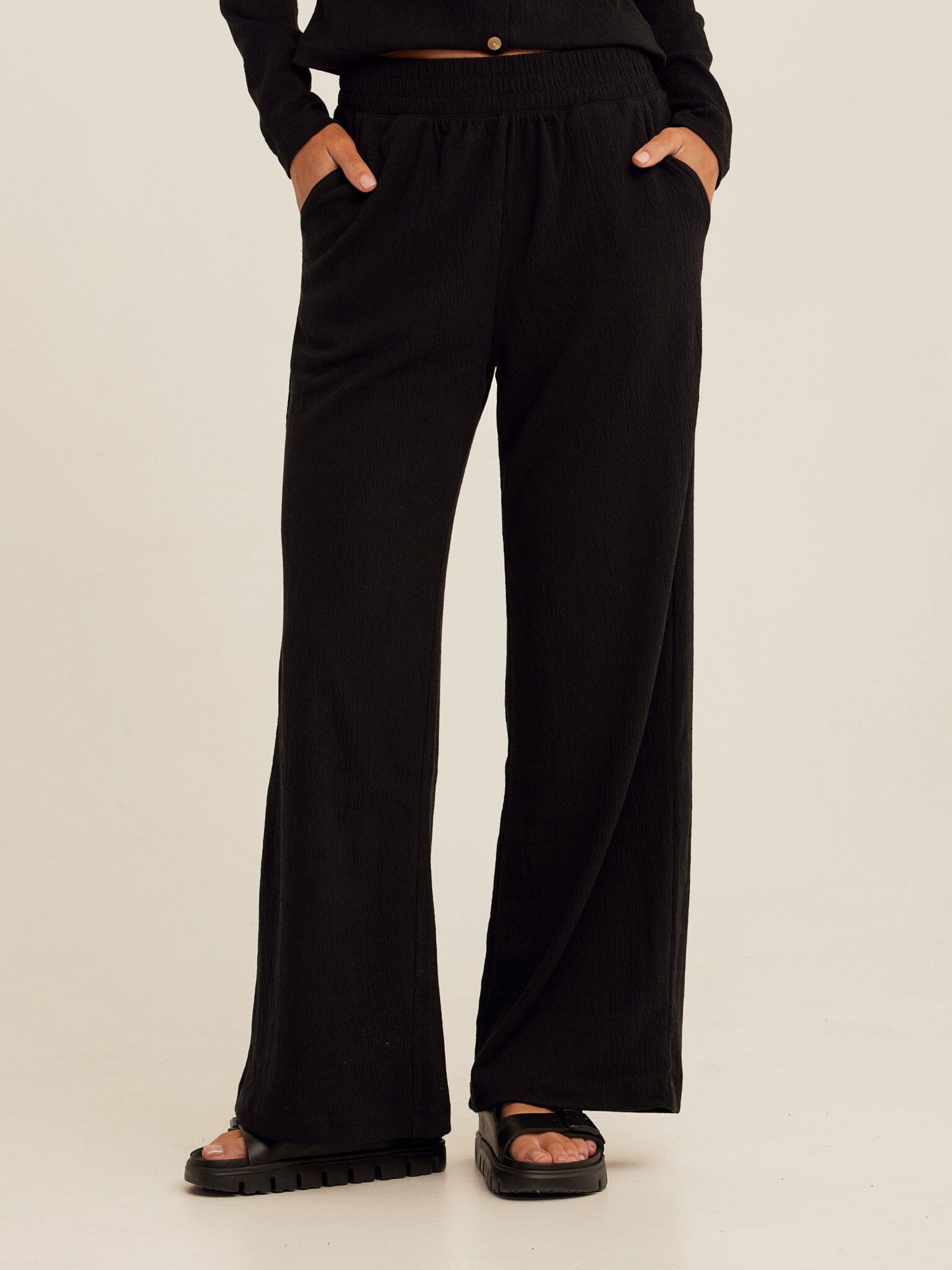 Experience relaxed comfort with the Smocked Jersey Wide Leg Pant. Made from soft, stretchy smocked jersey, this pull-on style features an easy elastic waist and a fluid wide-leg silhouette for everyday wear. Comfortable, versatile, and designed to move with you.