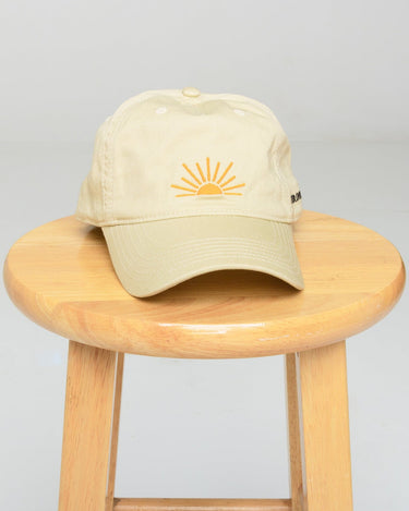 An embroidered hat featuring "Hotter Every Day" on the side and a sunrise on the front.