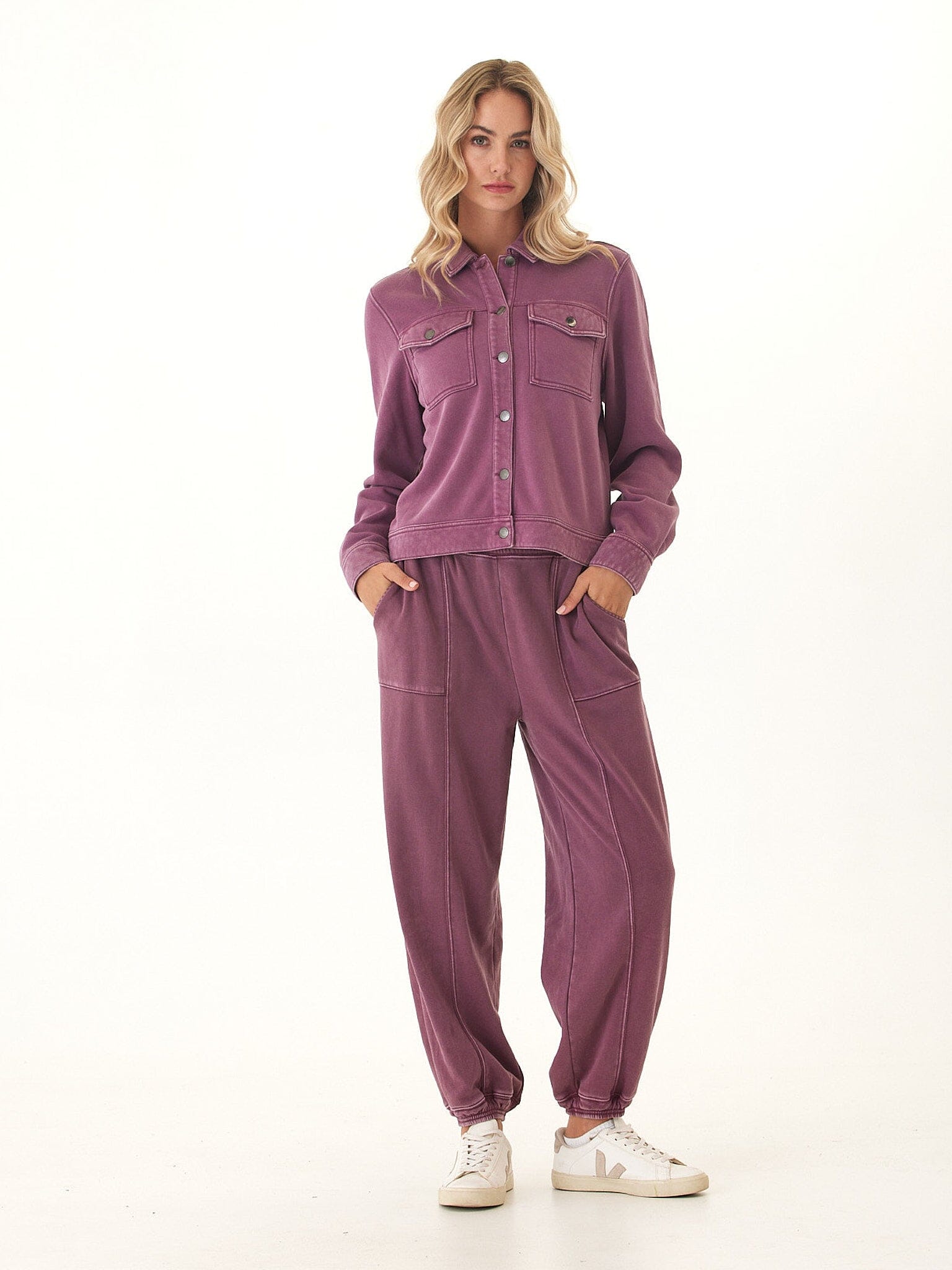 A modern twist on the classic utility jacket. Crafted from soft CVC Fleece, this style combines structure and comfort with a lived-in mineral wash finish. Designed with snap button closures, double chest pockets, and subtle seaming for a tailored yet relaxed fit. Perfect for layering over tees or pairing with the matching joggers for an effortlessly coordinated look that transitions from lounge to street with ease.
