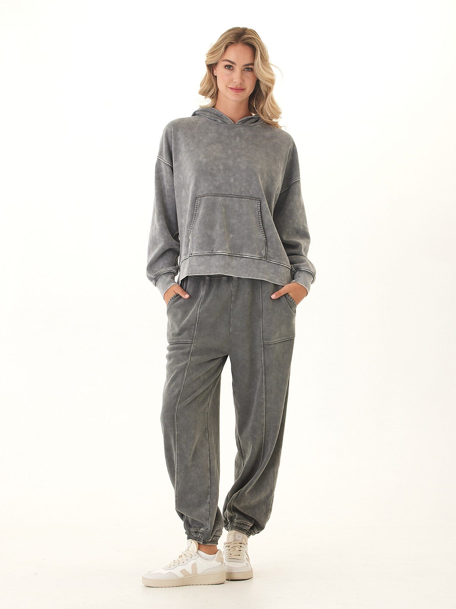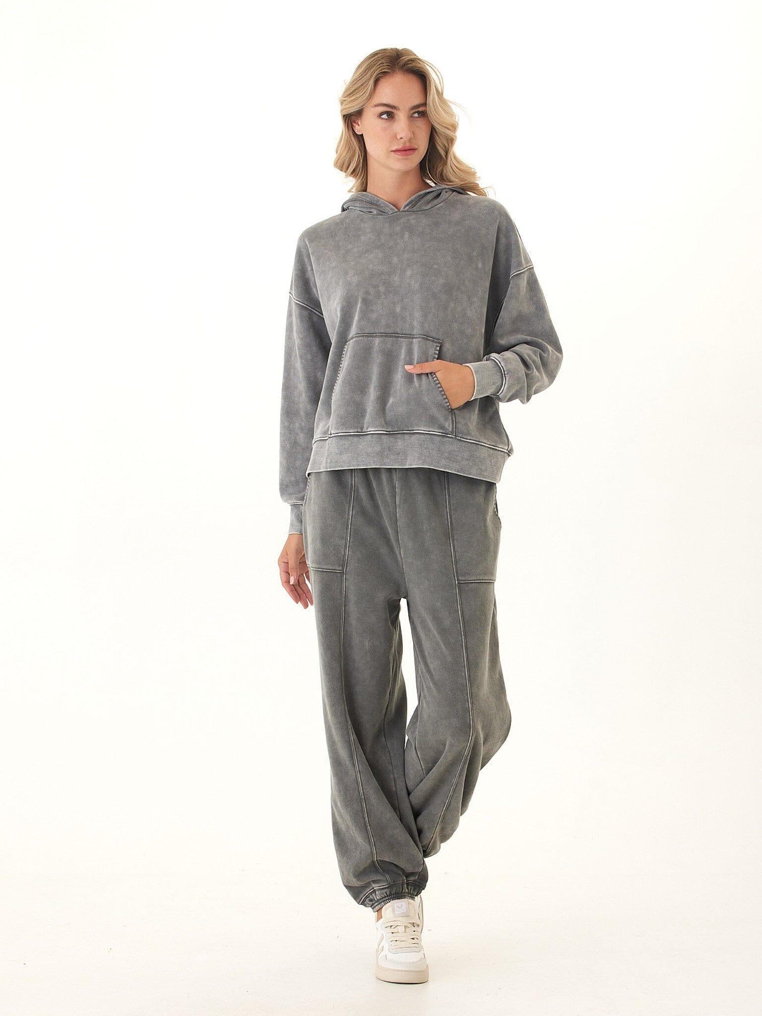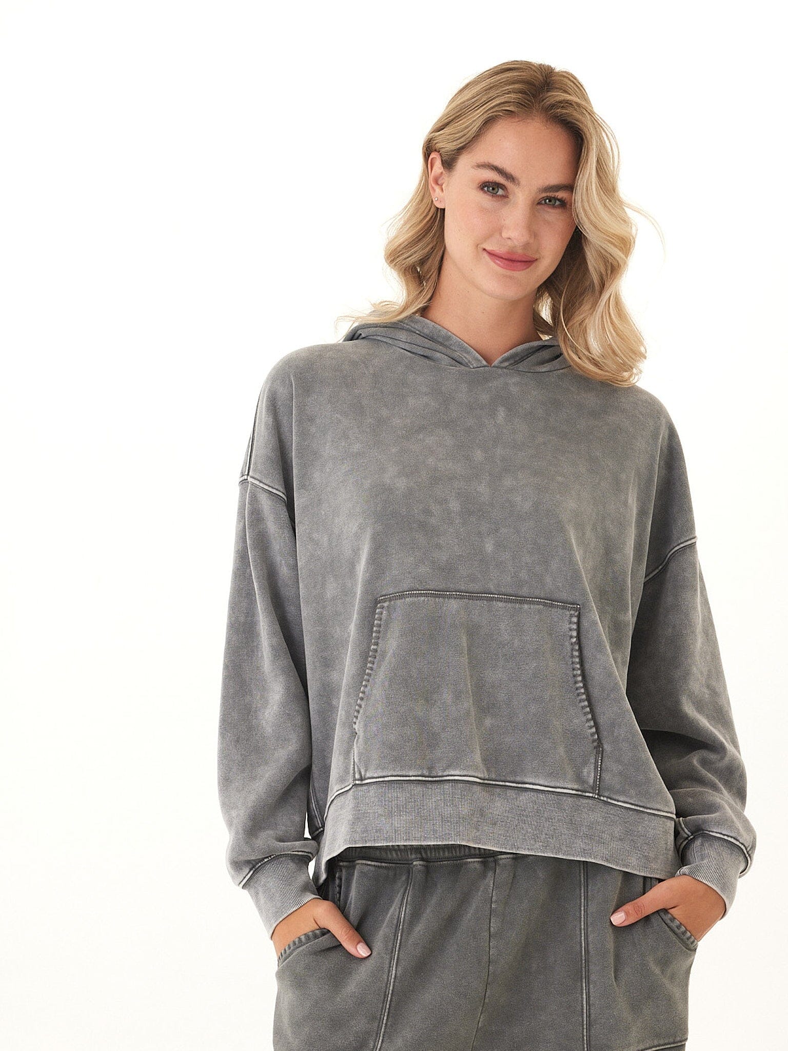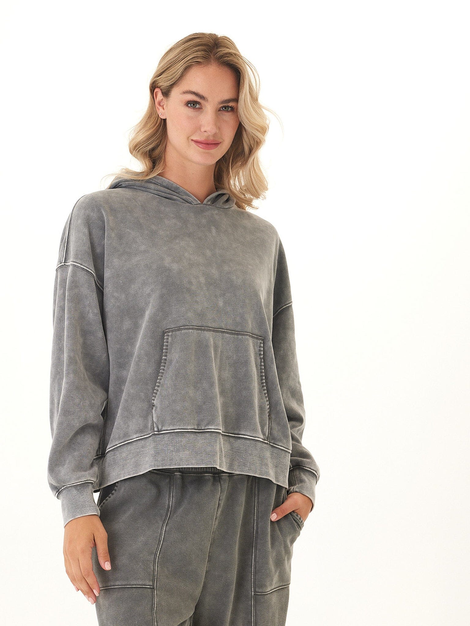 Laid-back and effortlessly cool, the Marcellina Pullover Hoodie features a soft mineral wash finish that gives each piece a unique, lived-in look. Crafted from our CVC Fleece for a cozy yet breathable feel, it’s designed with dropped shoulders, ribbed cuffs, and a front kangaroo pocket for easy comfort. The relaxed fit makes it perfect for lounging or layering—your new go-to for everyday ease with an edge.