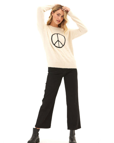 Stay warm and spread positivity with our Fuzzy Knit Peace Graphic Pullover. Made of soft, cozy material, it offers a classic fit and features a peace sign design. A perfect addition to your wardrobe for comfort and style.
