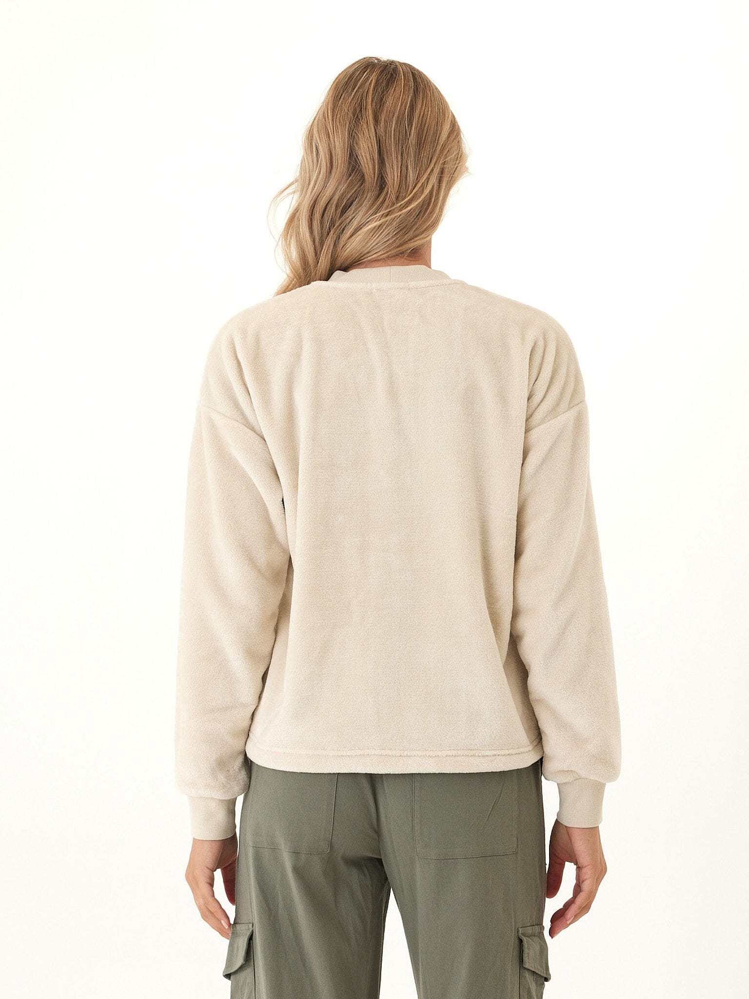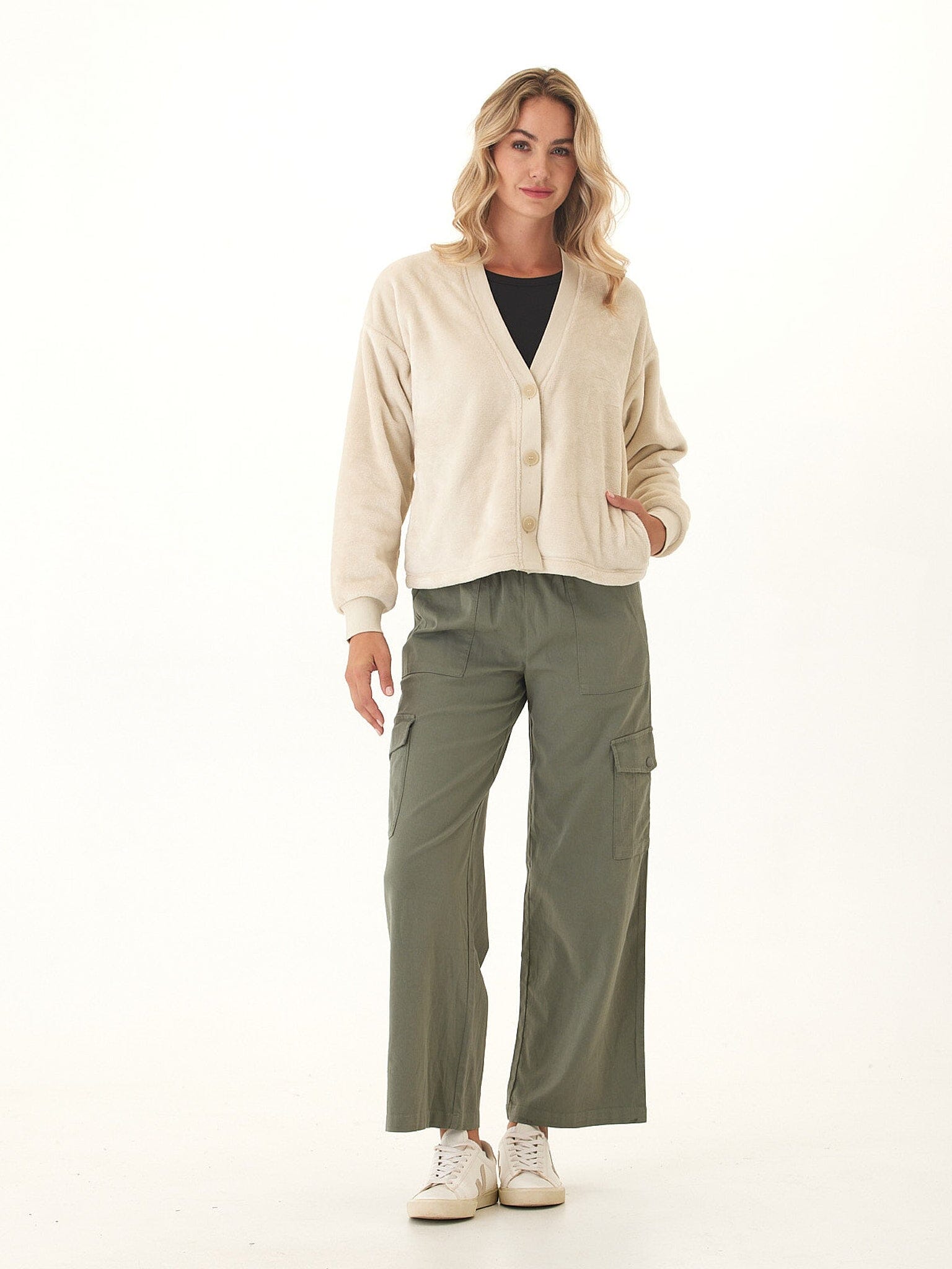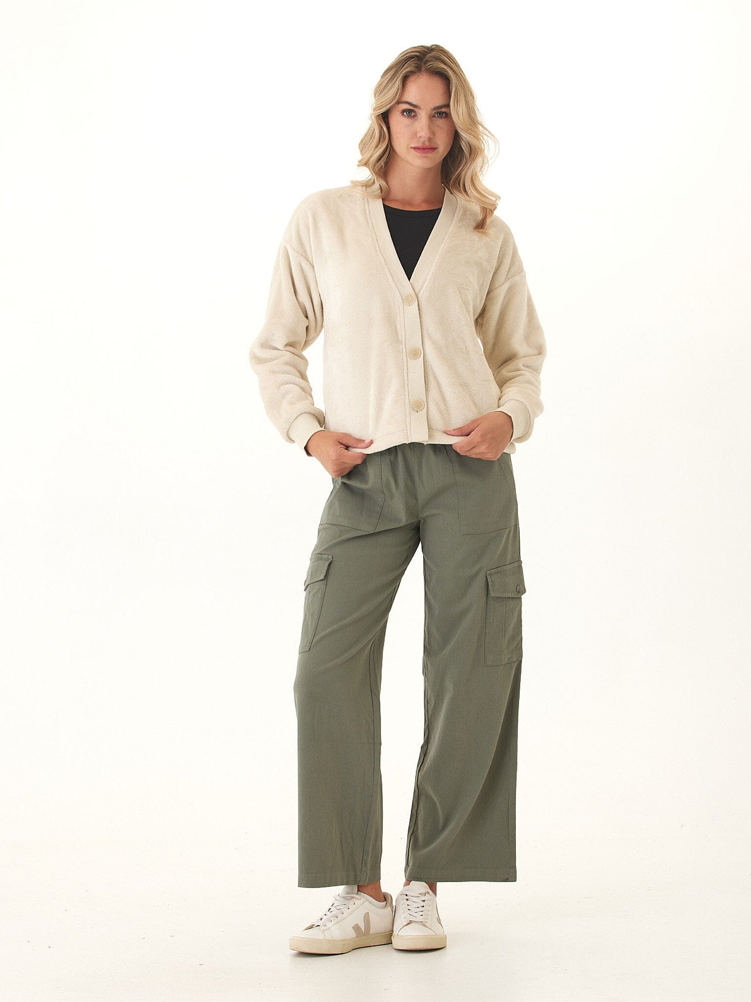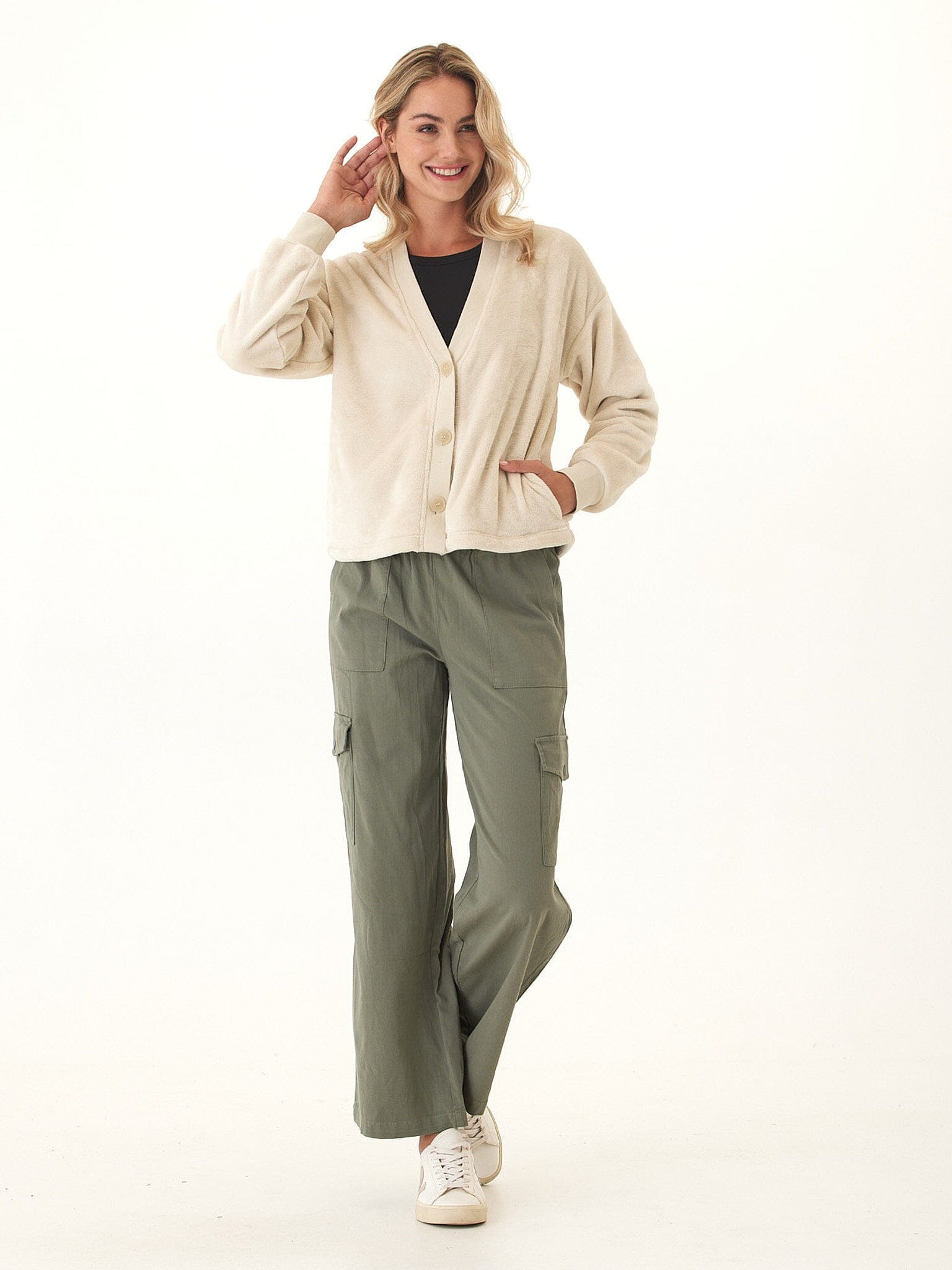 The perfect blend of cozy and refined. This button-front cardigan is made from soft fleece with a plush, velvety texture that feels as good as it looks. Designed with a relaxed fit, dropped shoulders, and functional front pockets for easy wear. Whether layered over a tee or paired with your favorite joggers, it brings laid-back polish to any look.