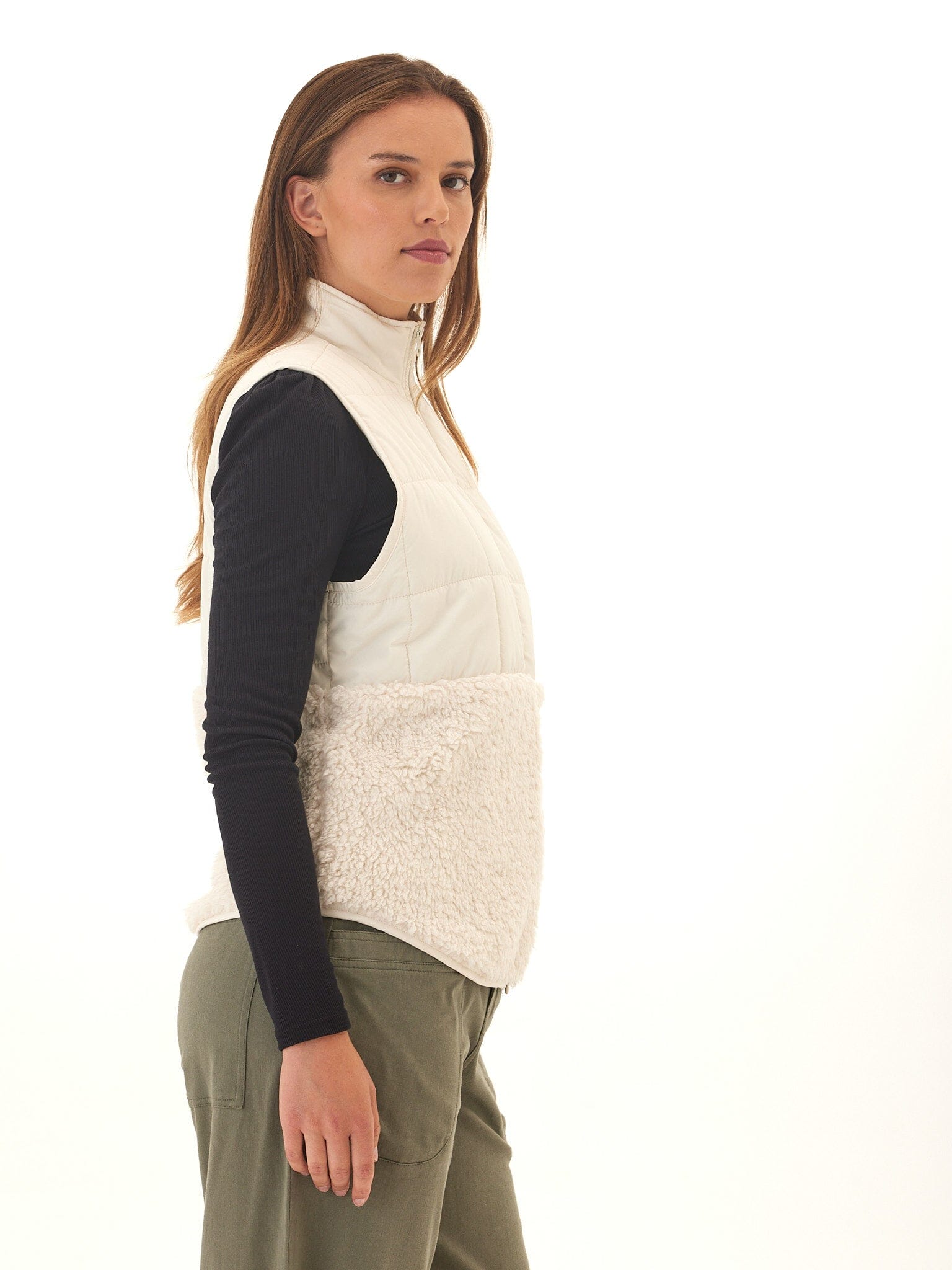 A cozy essential designed for crisp, transitional days. This quilted vest combines lightweight warmth with plush, textured softness, featuring a smooth, insulated upper and a sherpa-trimmed lower panel for a subtle contrast in feel and finish. The high stand collar adds extra protection from the chill, while the zip-front closure makes it easy to layer over your favorite long sleeves and sweaters. Effortlessly versatile, it’s the perfect piece for adding comfort and dimension to any cool-weather look.