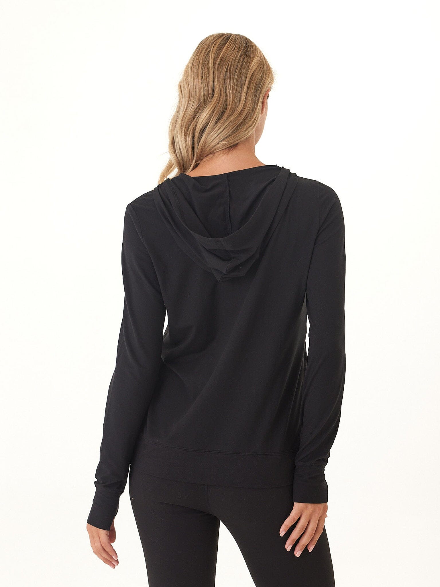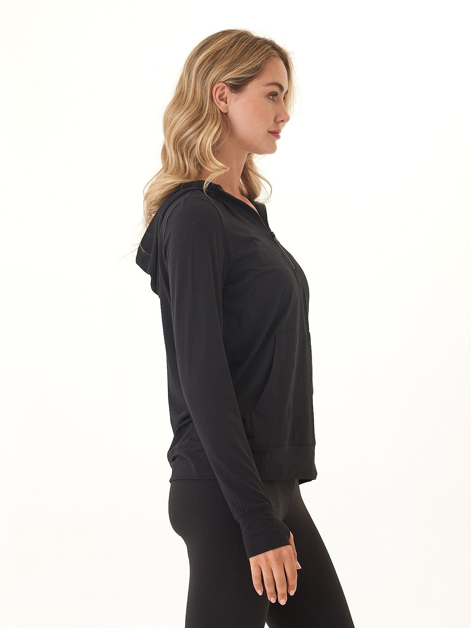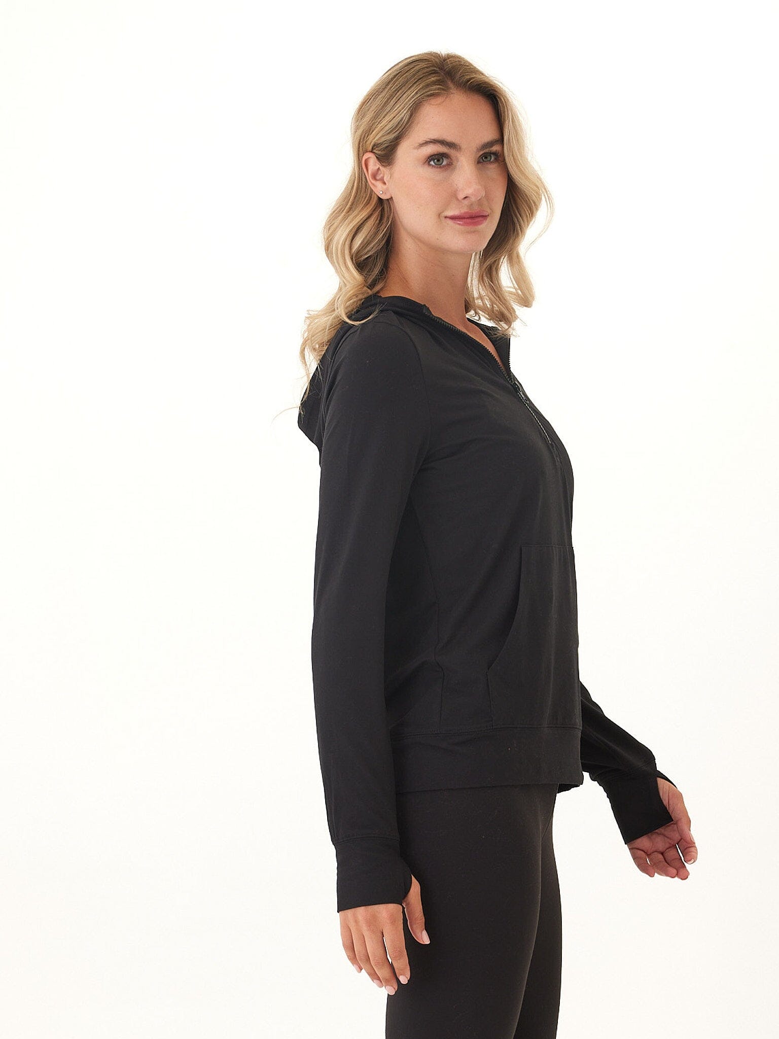 The Gretchen Quarter Zip Hoodie is your go-to layer for lightweight comfort and effortless style. Made from our ultra-soft Luxe Jersey, it features a smooth, breathable feel with the perfect amount of stretch. Designed with a quarter-zip neckline, kangaroo pocket, and thumbhole cuffs for added function and warmth. Ideal for workouts, weekend errands, or layering on cooler days, this hoodie keeps you comfortable wherever the day takes you.