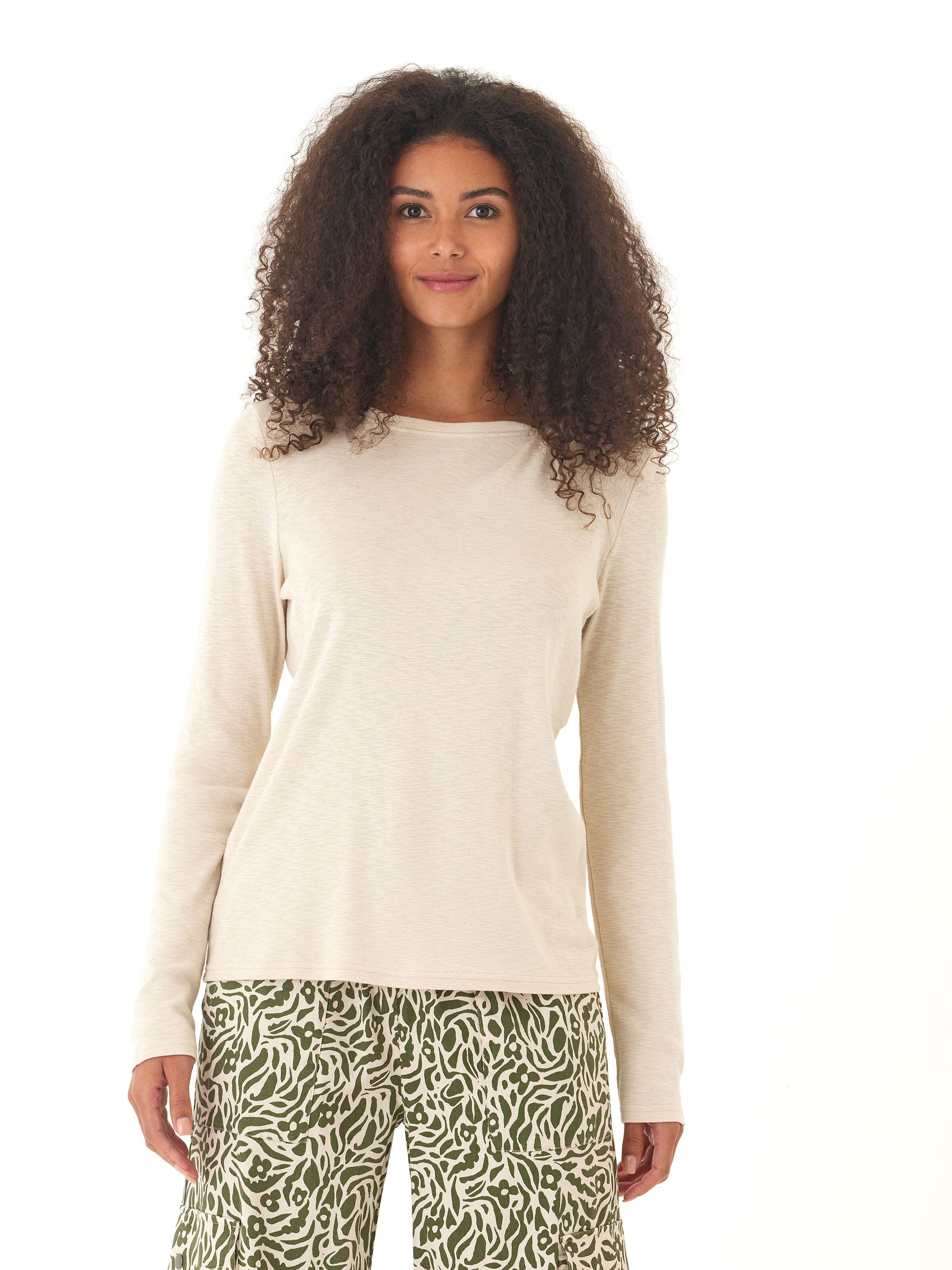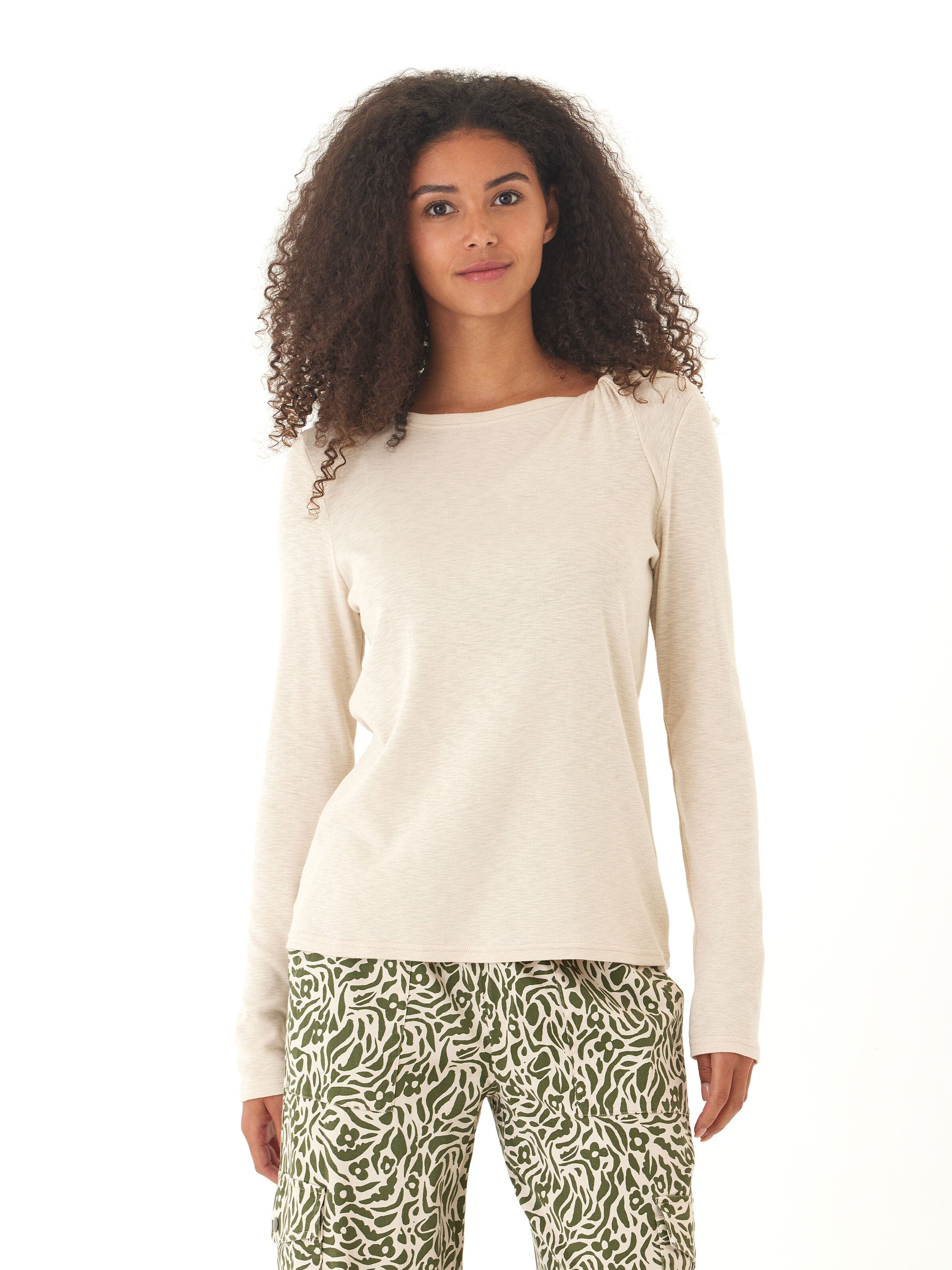 Effortlessly chic with a touch of edge, this long-sleeve top is crafted from lightweight textured slub jersey for breathable comfort and subtle dimension. A soft drape and relaxed fit make it perfect for everyday wear, while the unique twisted shoulder detail and slightly asymmetrical neckline elevate the look beyond your basic tee.