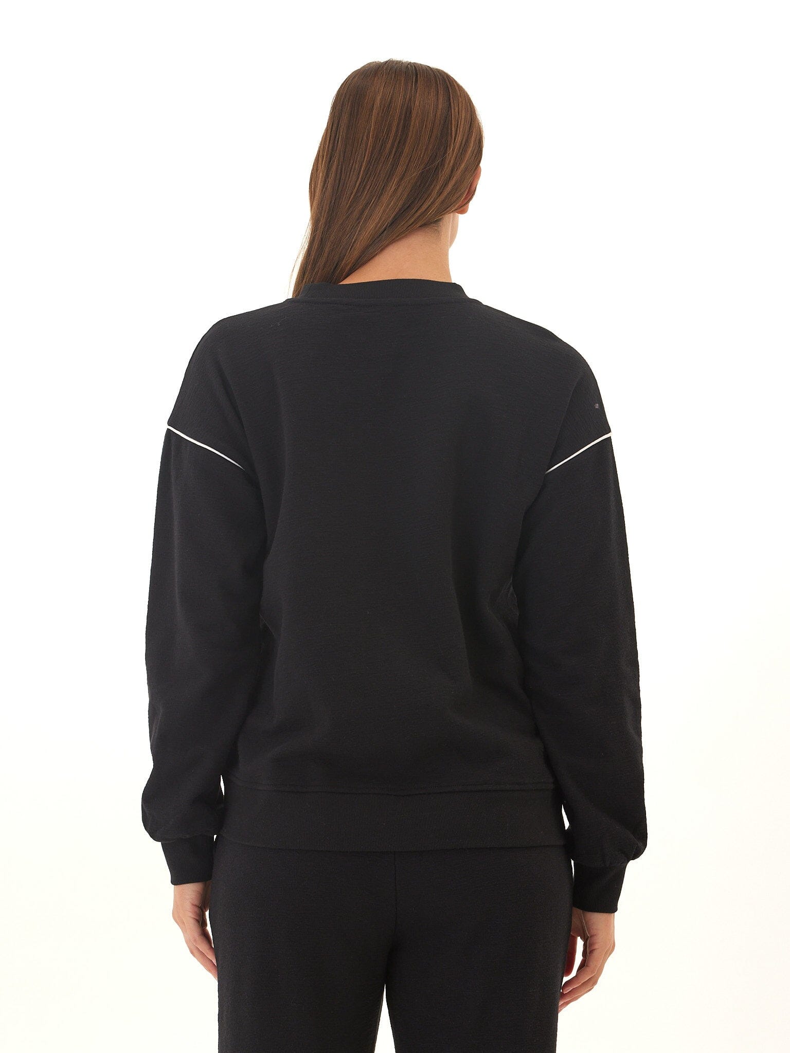 An elevated take on a classic crew. This sweatshirt blends everyday comfort with modern detailing, featuring contrast piping and a subtle front seam for a structured, contemporary look. Crafted from a soft, midweight fleece, it offers a relaxed fit with ribbed cuffs and hem for a clean finish. Perfect for pairing with matching pants or styling solo for a polished yet laid-back vibe.