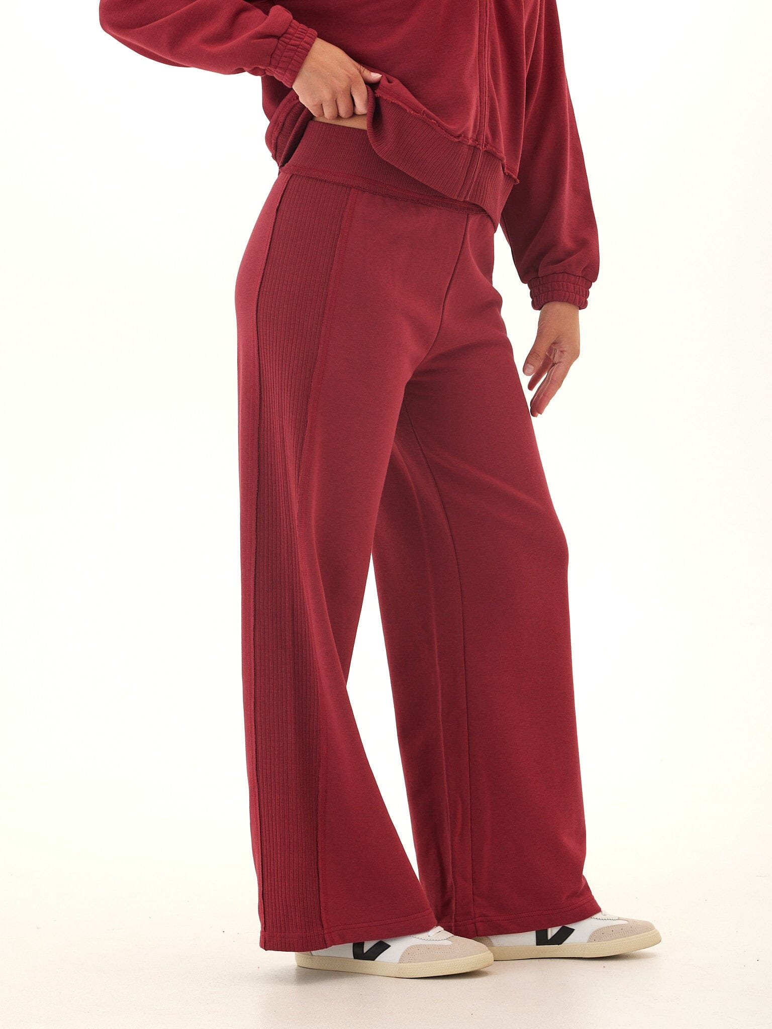 A relaxed essential designed for effortless comfort. Crafted from our soft cotton blend terry, these wide-leg pants feature a ribbed side panel detail that adds texture and movement to the clean silhouette. The elastic waistband ensures an easy, pull-on fit, while the fluid drape gives them an elevated yet laid-back feel — perfect for lounging at home or styling with sneakers for a casual day out. Pair with the matching hoodie for a coordinated look.