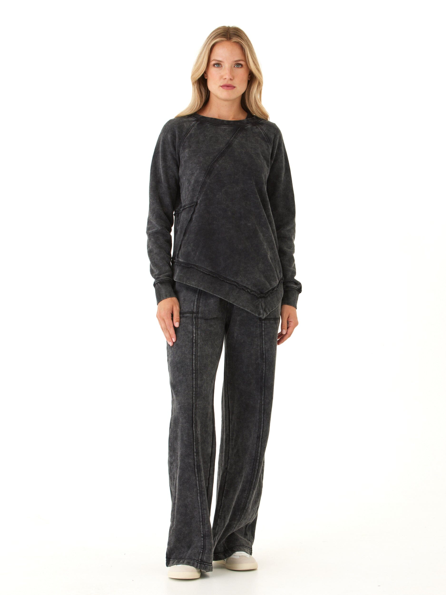Laid-back comfort meets effortless edge. Made from our soft washed terry fabric, these wide leg pants feature exposed seam details, deep pockets, and a relaxed drape that moves with you. Finished with an elastic waistband for an easy fit, they’re your go-to for lounging, errands, or pairing with the matching sweatshirt for a complete look.