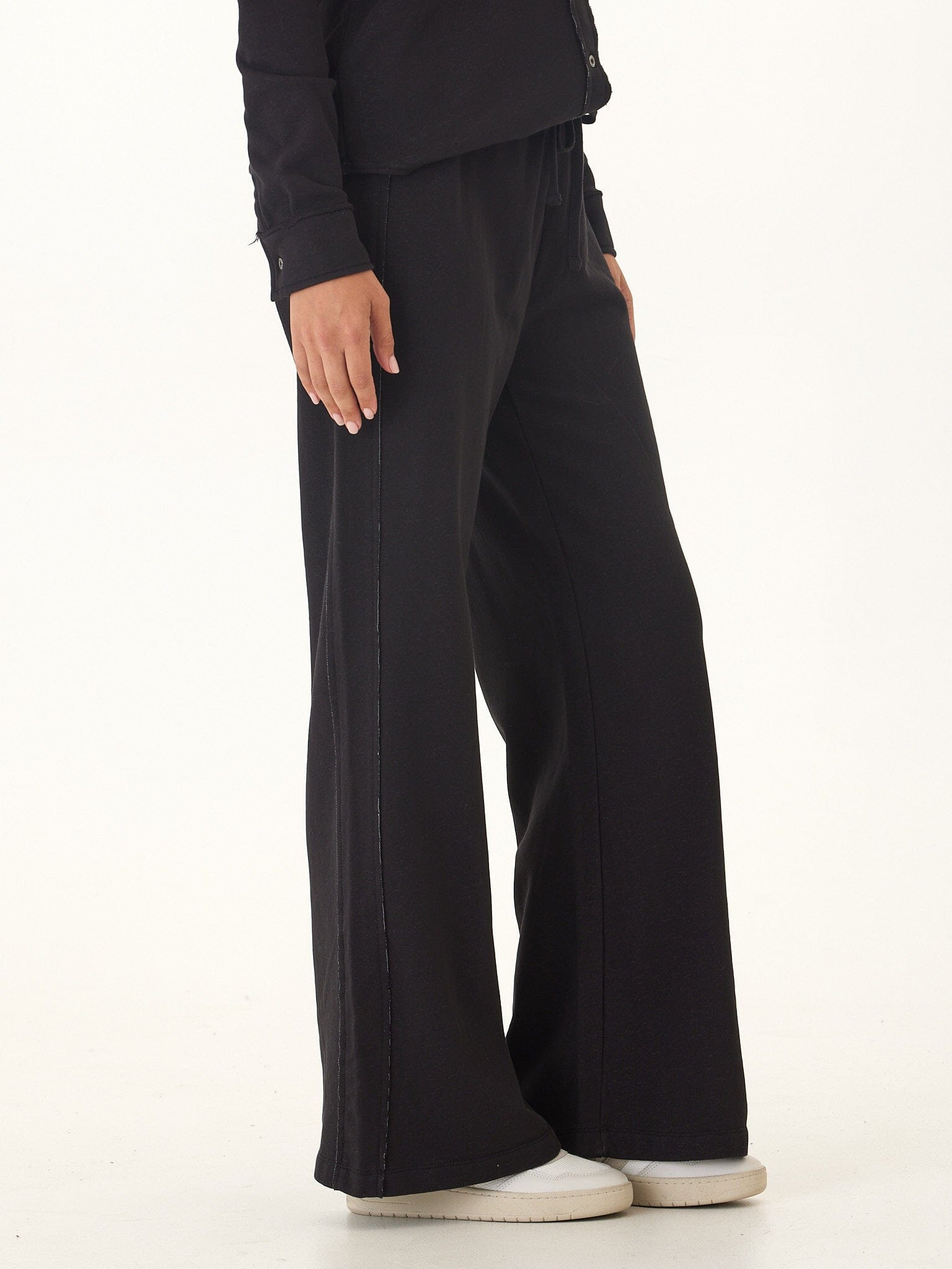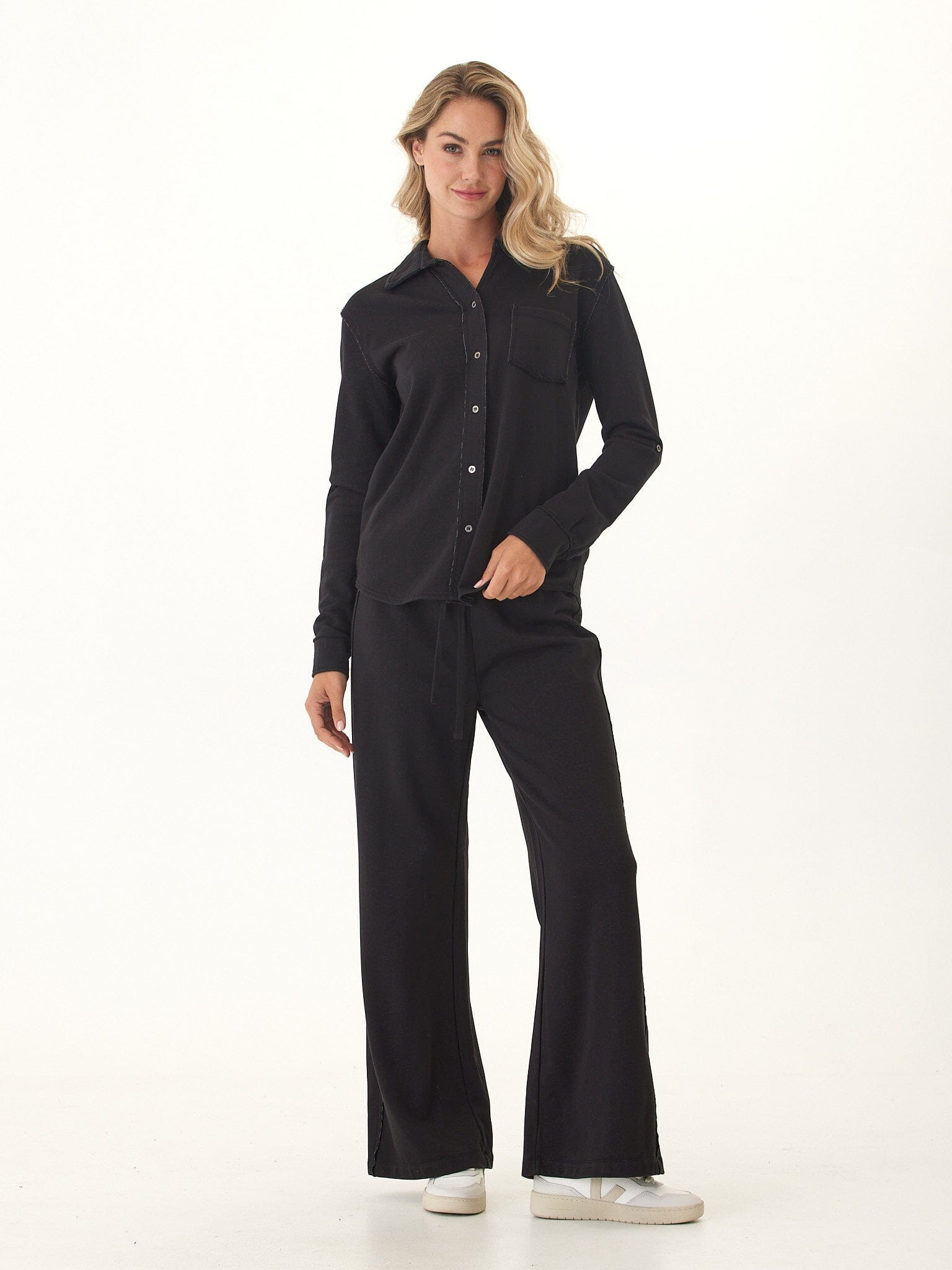 Relaxed, soft, and effortlessly flattering — this wide leg pant redefines everyday comfort. Made from a breathable cotton blend terry, it features a smooth elastic waistband with a drawcord for a customizable fit and patch pockets at the back for a casual, modern look. The wide leg silhouette drapes beautifully, making it perfect for lounging, travel, or everyday wear. Pair it with the matching button-up for an elevated set.