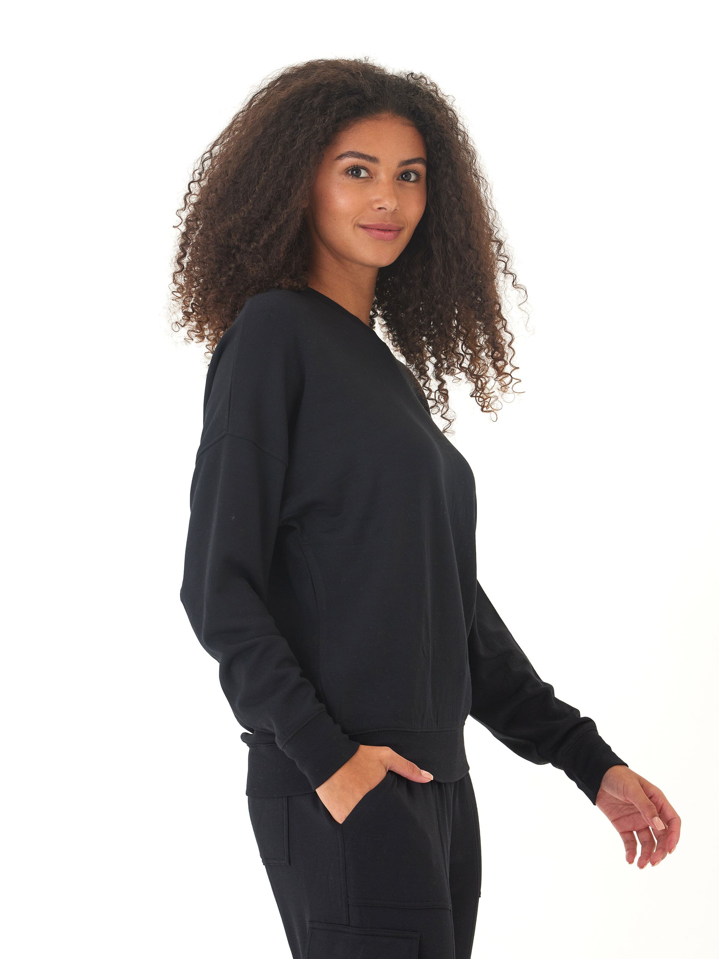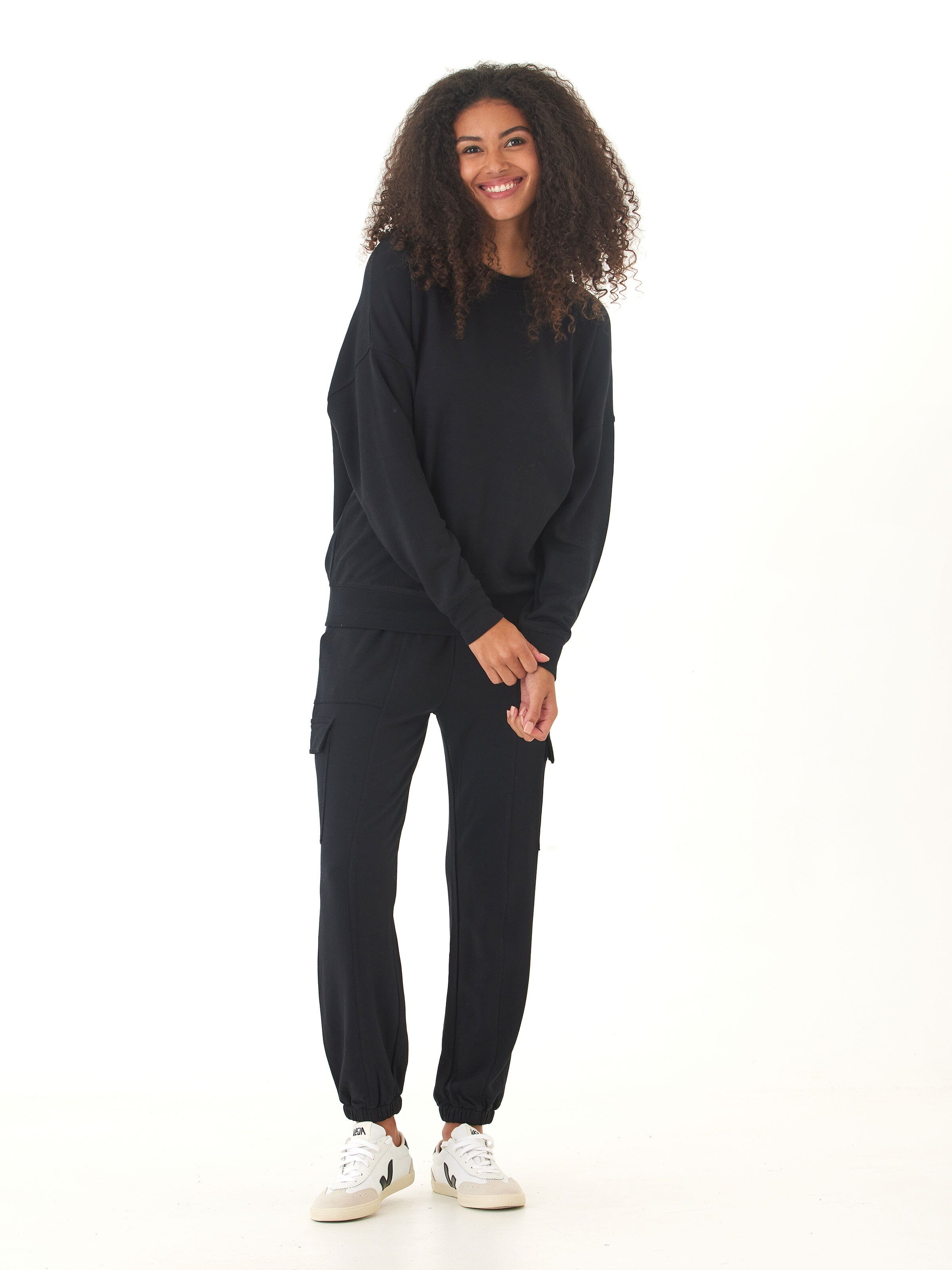 This soft black sweatshirt is everything—cozy, flattering, and perfect for everyday wear. The material is super soft without feeling too heavy, and it layers beautifully with just about anything. It holds its shape, washes well, and instantly becomes a go-to piece for school drop-off, lounging, or weekend errands. Love it!