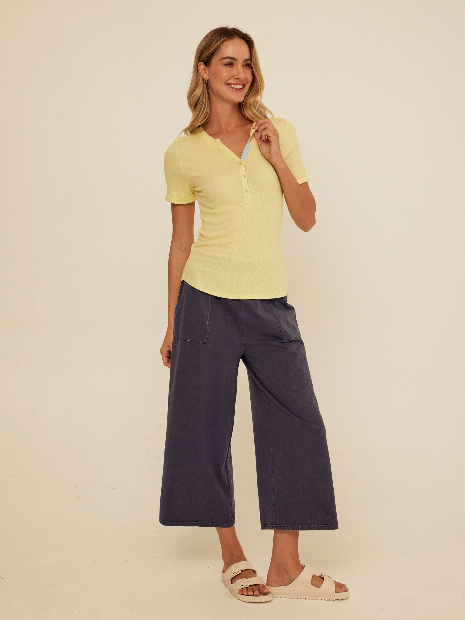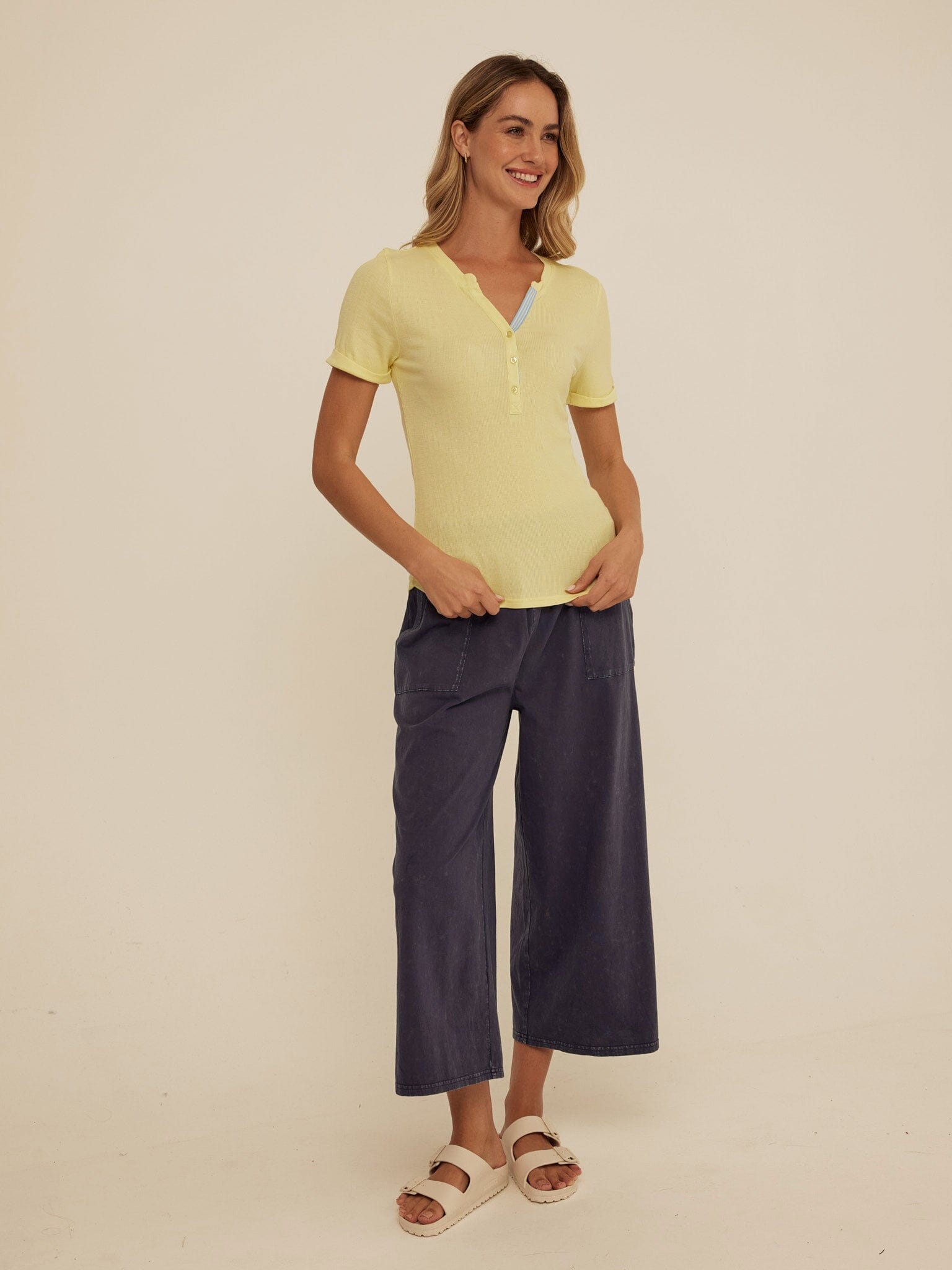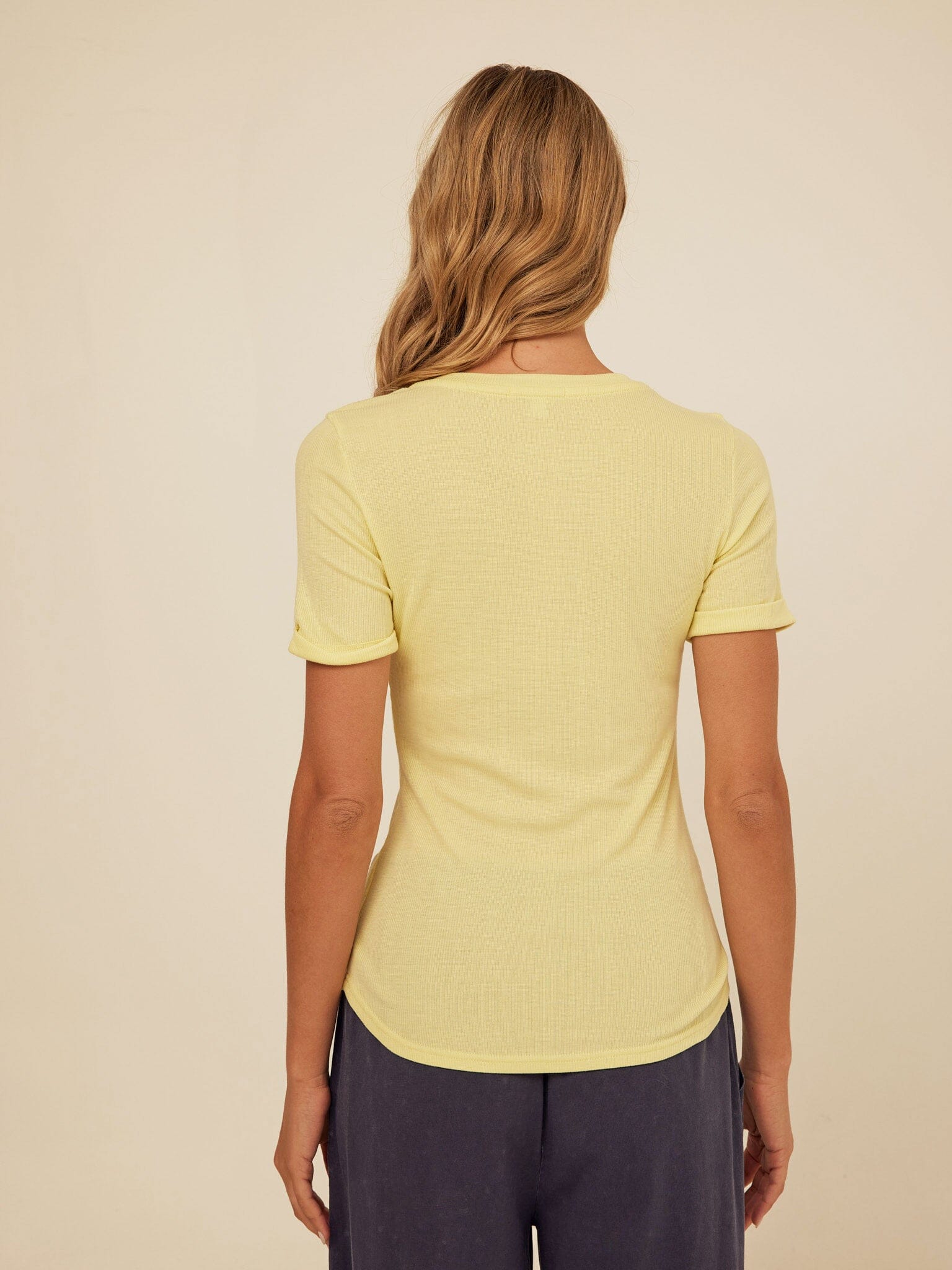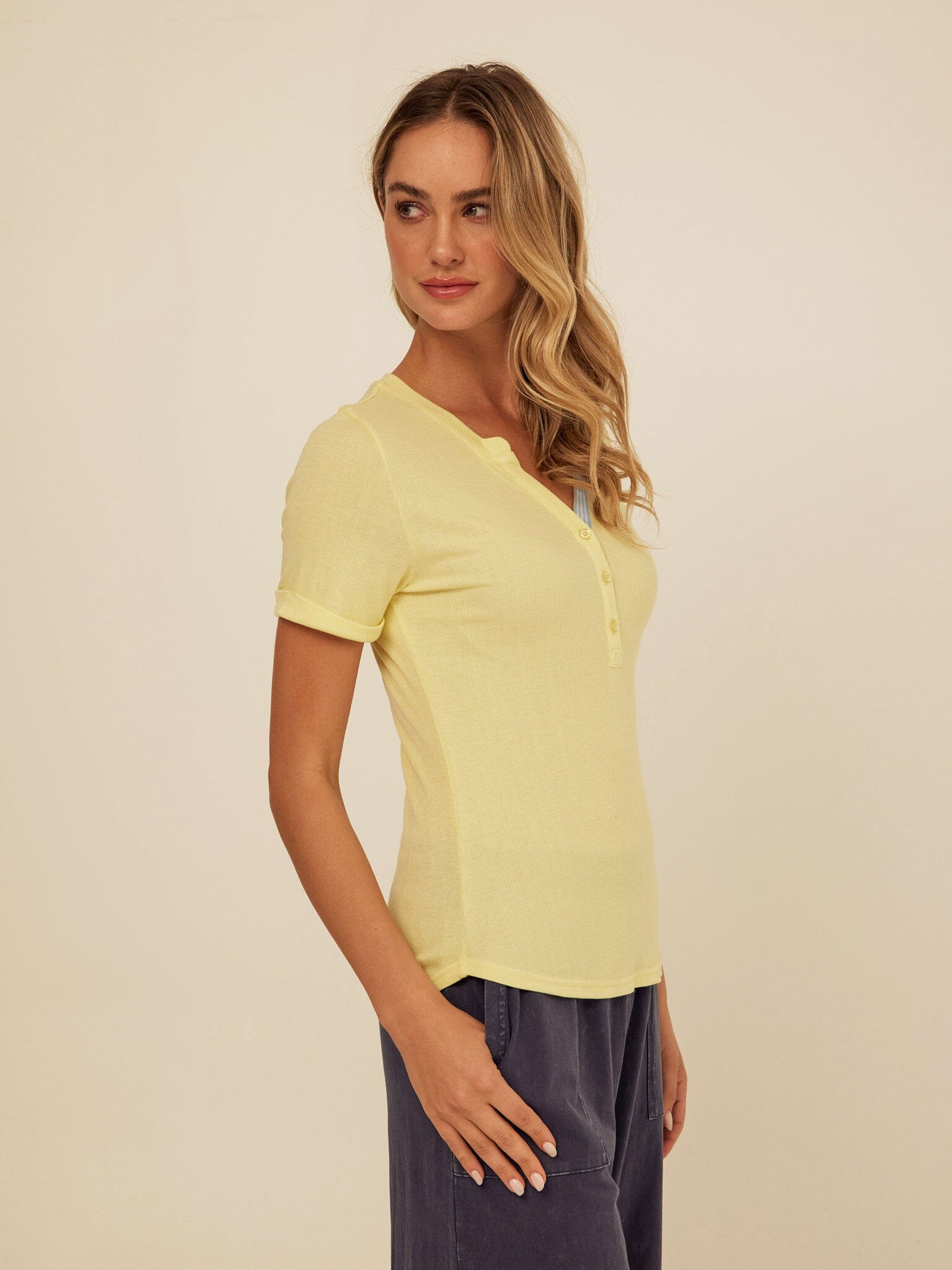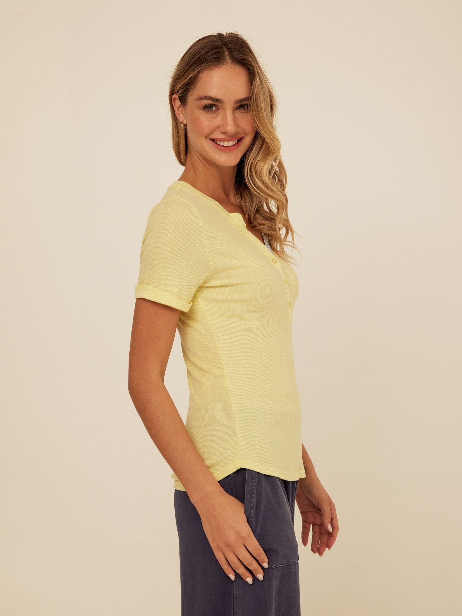 The Akia Henley Tee is made from soft feather rib fabric with a smooth, lightweight feel that hugs just right. Designed with a classic henley neckline, subtle button placket, and contrast trim detail, it adds a refined touch to an everyday essential. Style it with our jersey pants for an effortless, comfortable look you can wear all day.