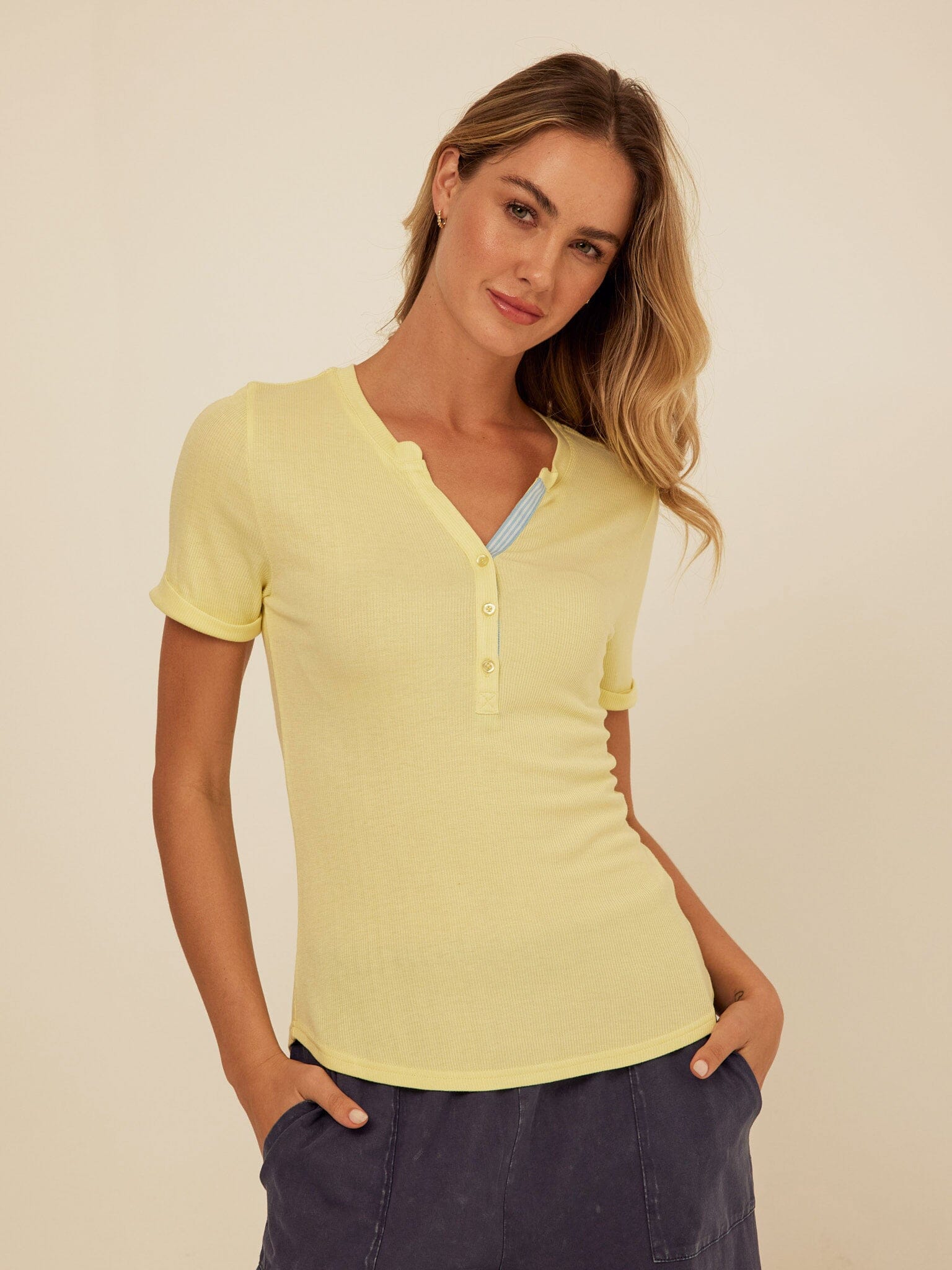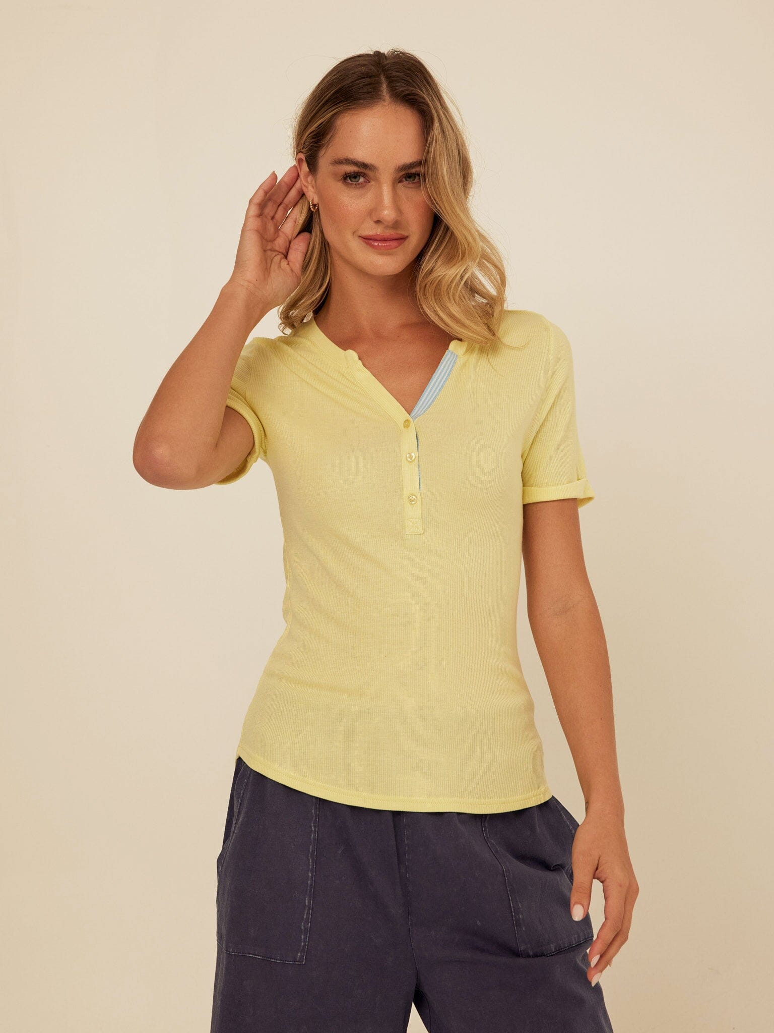 Akia Feather Rib Trim Detail Henley Tee