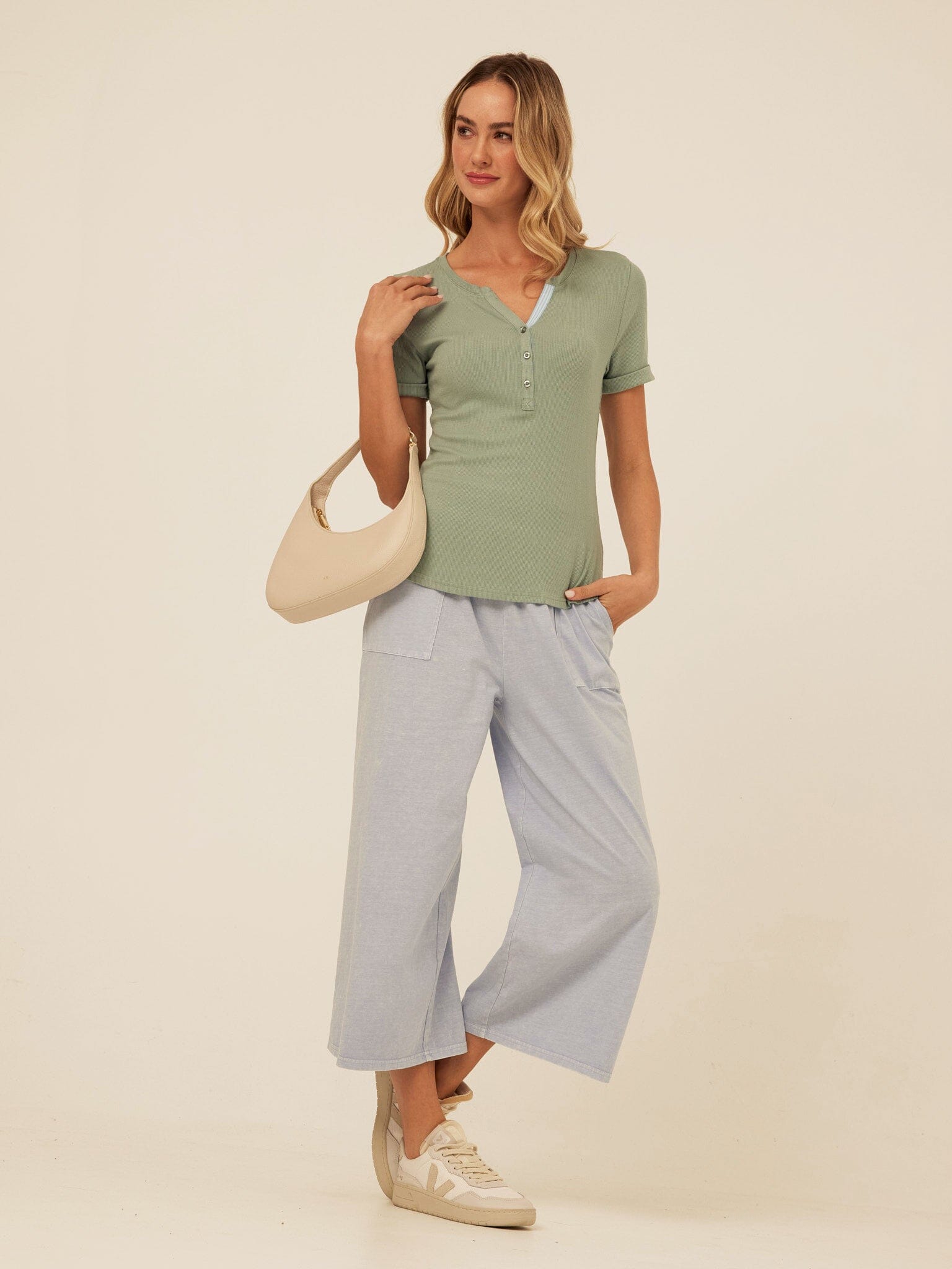 The Akia Henley Tee is made from soft feather rib fabric with a smooth, lightweight feel that hugs just right. Designed with a classic henley neckline, subtle button placket, and contrast trim detail, it adds a refined touch to an everyday essential. Style it with our jersey pants for an effortless, comfortable look you can wear all day.