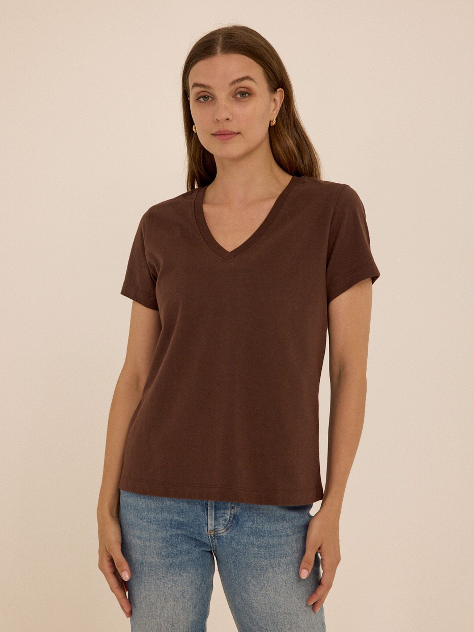 The everyday tee, refined. The Aria Organic Cotton V-Neck Tee is made from our highest quality 100% organic cotton, offering a naturally soft hand feel with a clean, structured drape. Designed with a flattering V neckline and an easy fit, it brings a refined simplicity to everyday dressing.