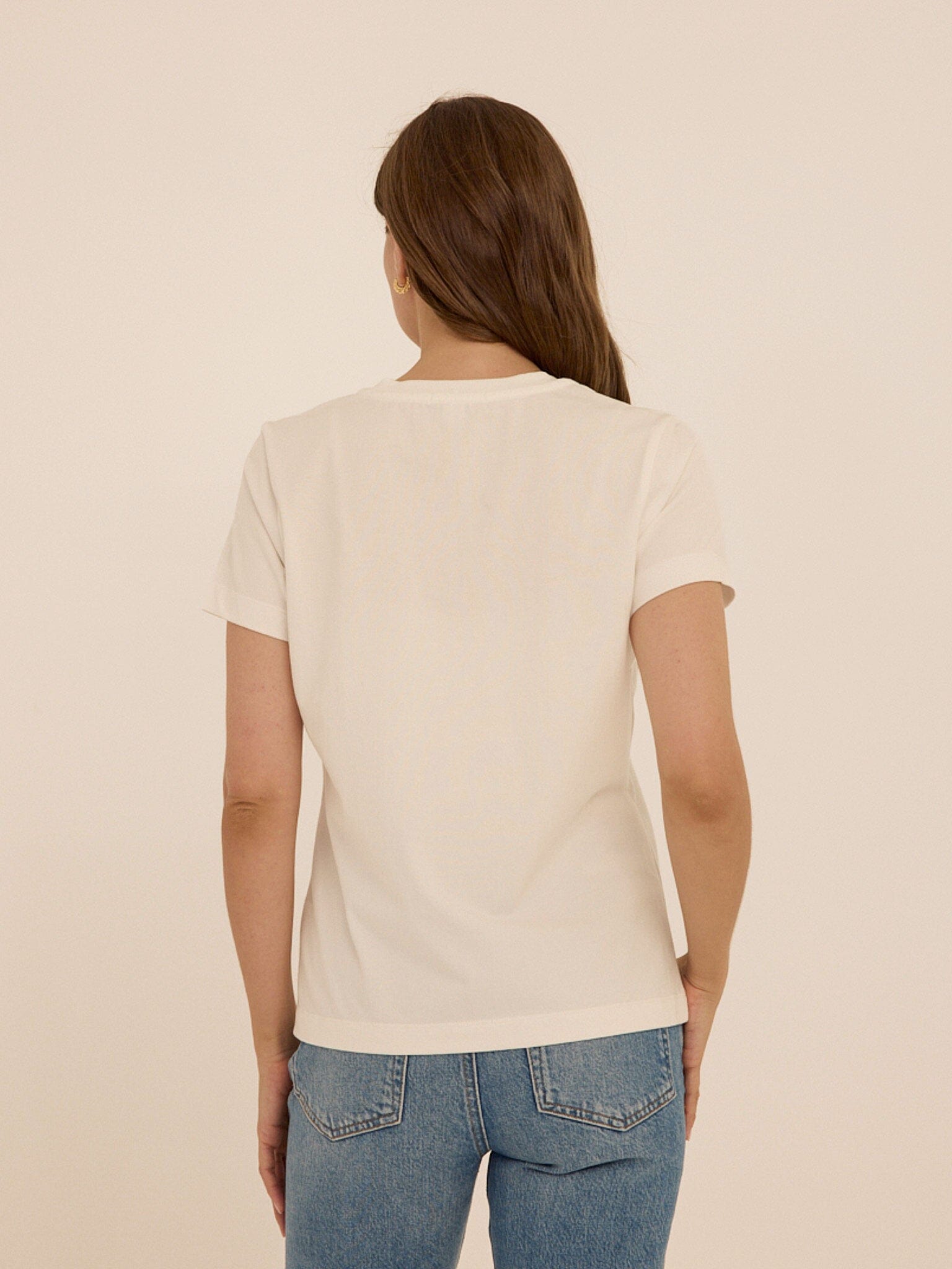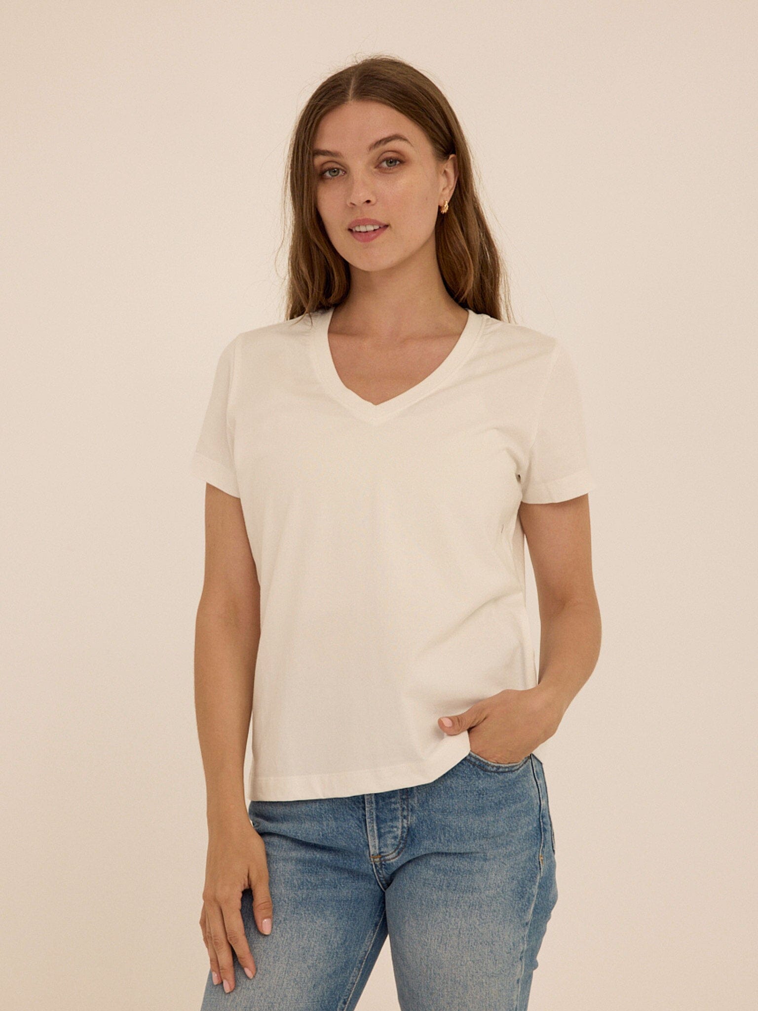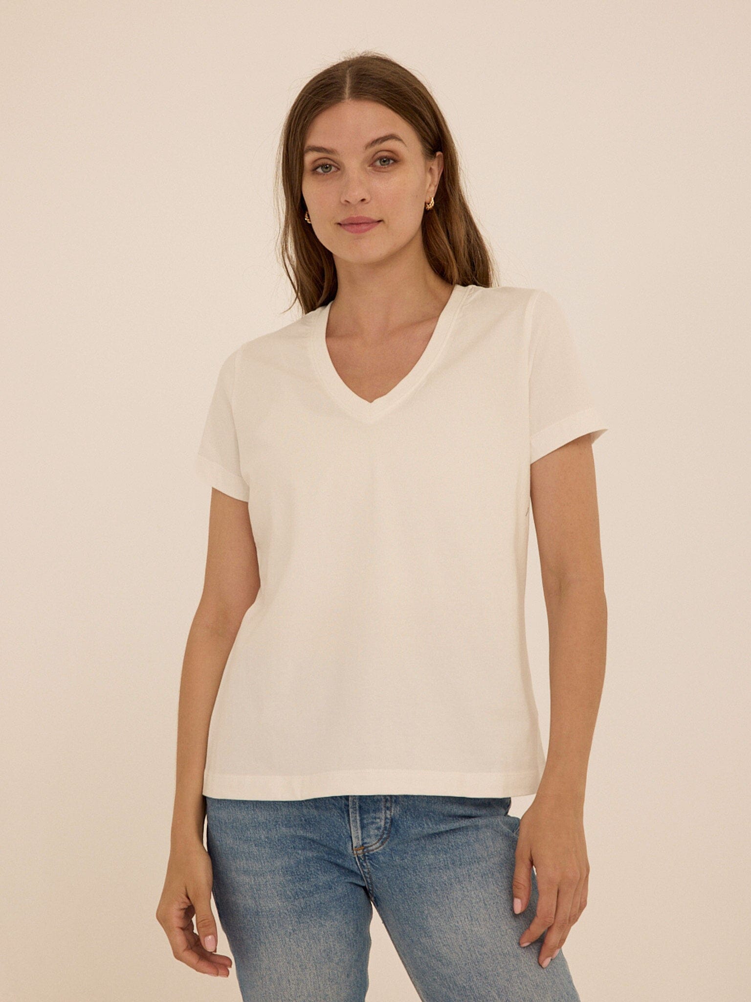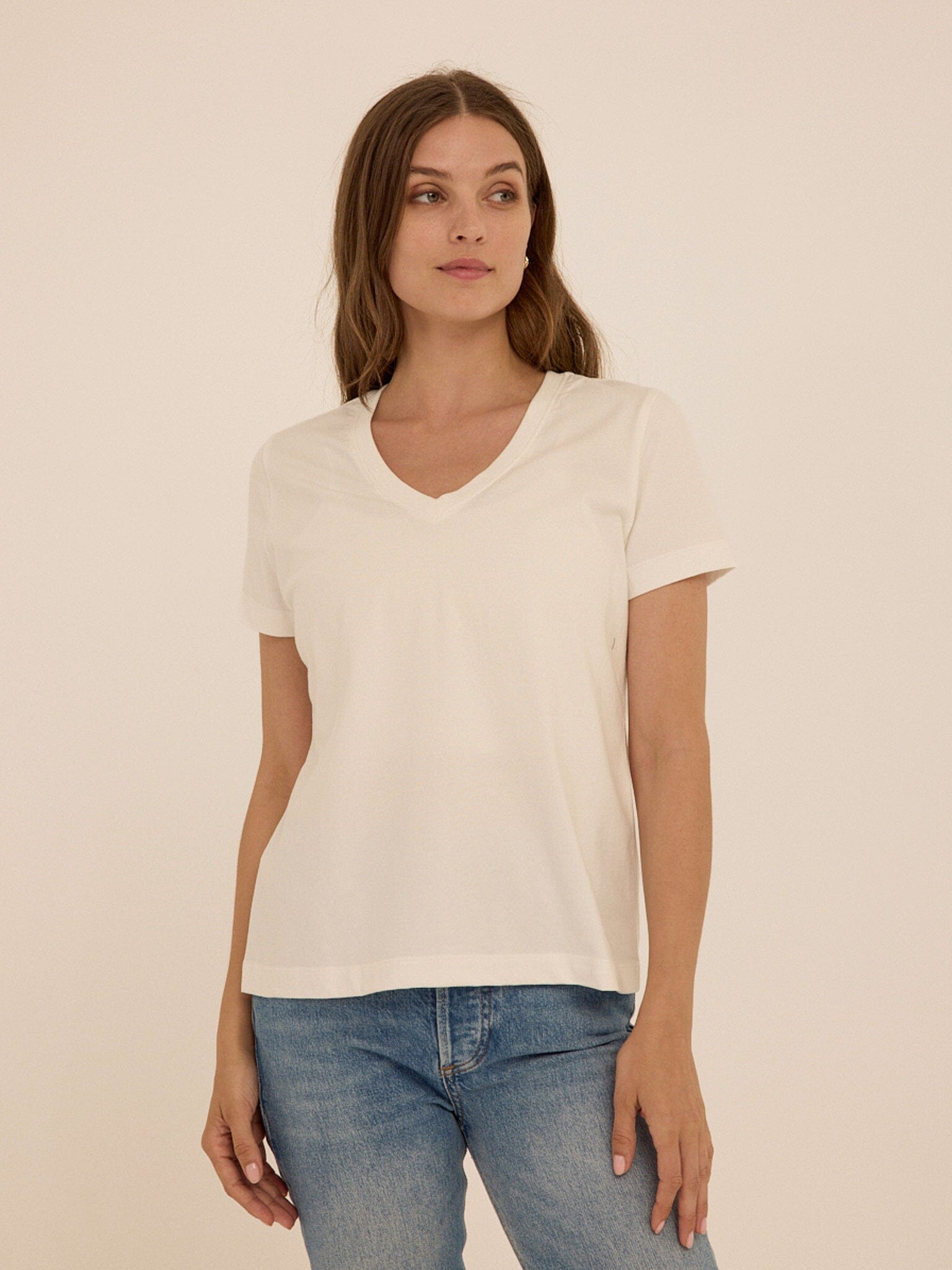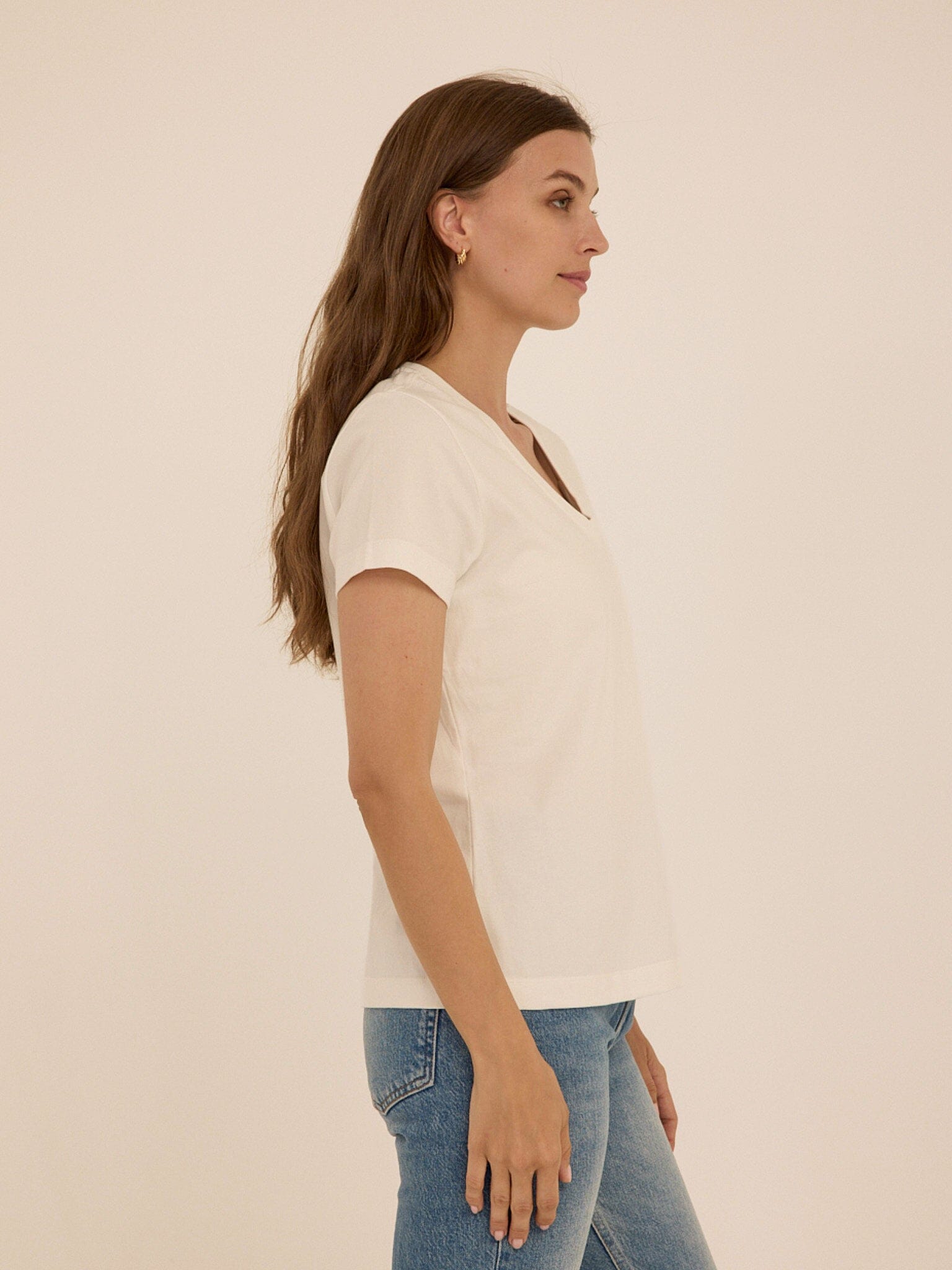 The everyday tee, refined. The Aria Organic Cotton V-Neck Tee is made from our highest quality 100% organic cotton, offering a naturally soft hand feel with a clean, structured drape. Designed with a flattering V neckline and an easy fit, it brings a refined simplicity to everyday dressing.
