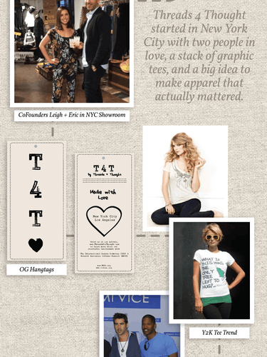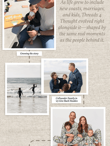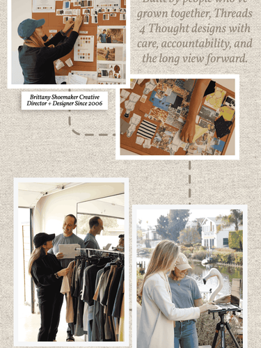 Threads 4 Thought began in New York City in 2006, when Leigh and Eric Fleet set out to build a more thoughtful kind of apparel company. What started as a small run of responsibly made graphic tees quickly found its way into everyday wardrobes — and onto unexpected stages. As life evolved, so did the brand. Marriage. Children. A move to California. A deeper connection to the natural world and a clearer commitment to protecting it. Partnerships with retailers like Whole Foods and Nordstrom expanded their reach, while the collections matured into what Threads 4 Thought is known for today: elevated comfort, effortless versatility, and timeless essentials designed for real life. Now based in California, Leigh and Eric lead the brand alongside their team—guided by trust, care, and shared responsibility.