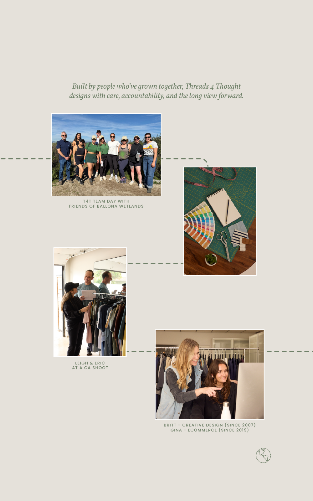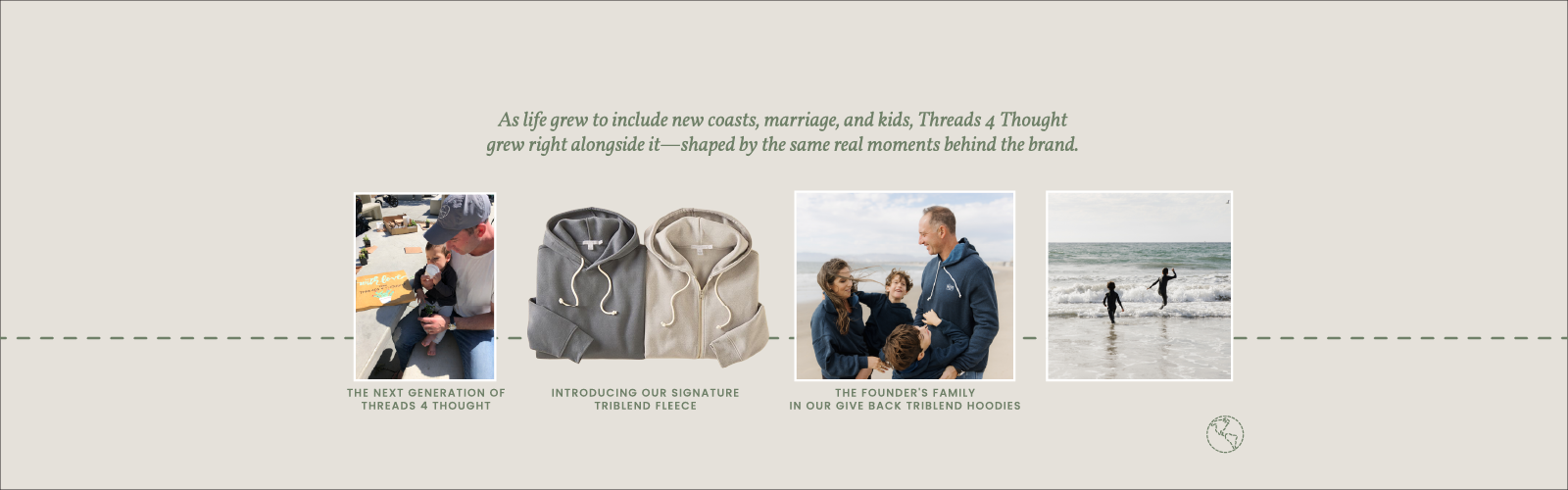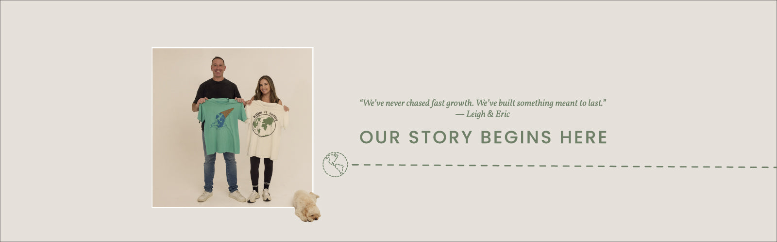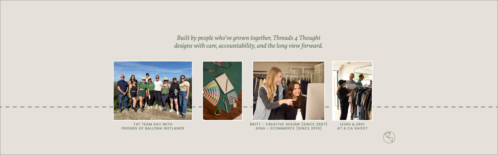 Threads 4 Thought began in New York City in 2006, when Leigh and Eric Fleet set out to build a more thoughtful kind of apparel company. What started as a small run of responsibly made graphic tees quickly found its way into everyday wardrobes — and onto unexpected stages. As life evolved, so did the brand. Marriage. Children. A move to California. A deeper connection to the natural world and a clearer commitment to protecting it. Partnerships with retailers like Whole Foods and Nordstrom expanded their reach, while the collections matured into what Threads 4 Thought is known for today: elevated comfort, effortless versatility, and timeless essentials designed for real life. Now based in California, Leigh and Eric lead the brand alongside their team—guided by trust, care, and shared responsibility.