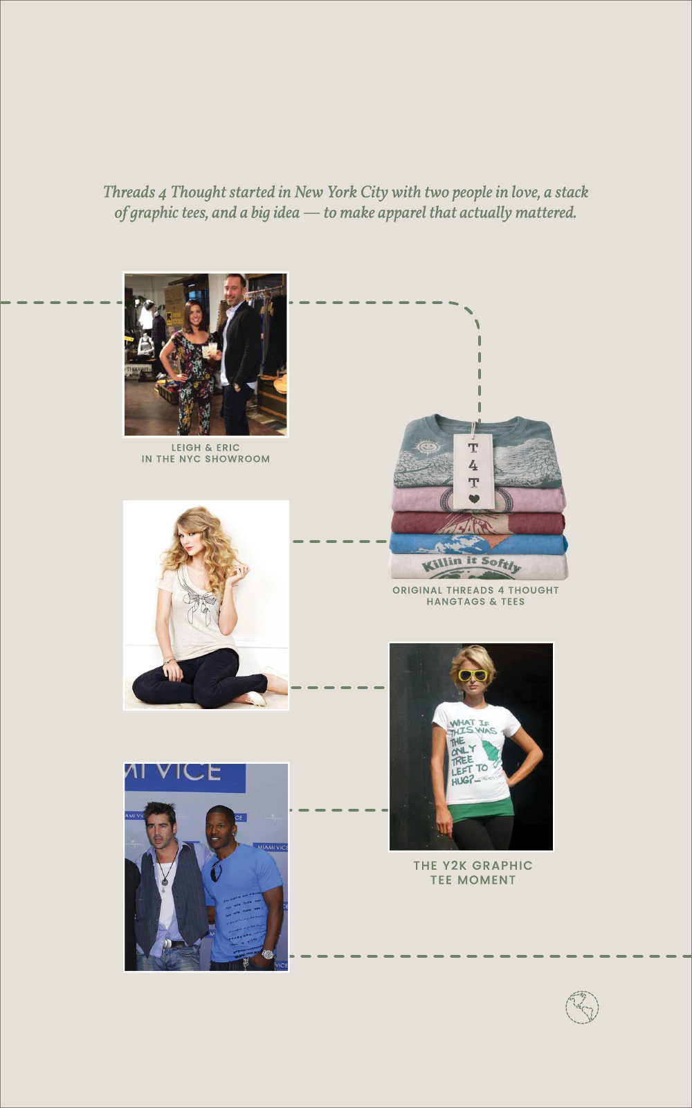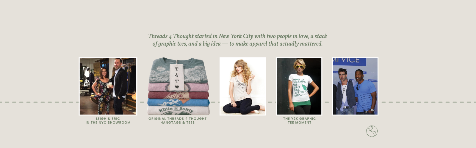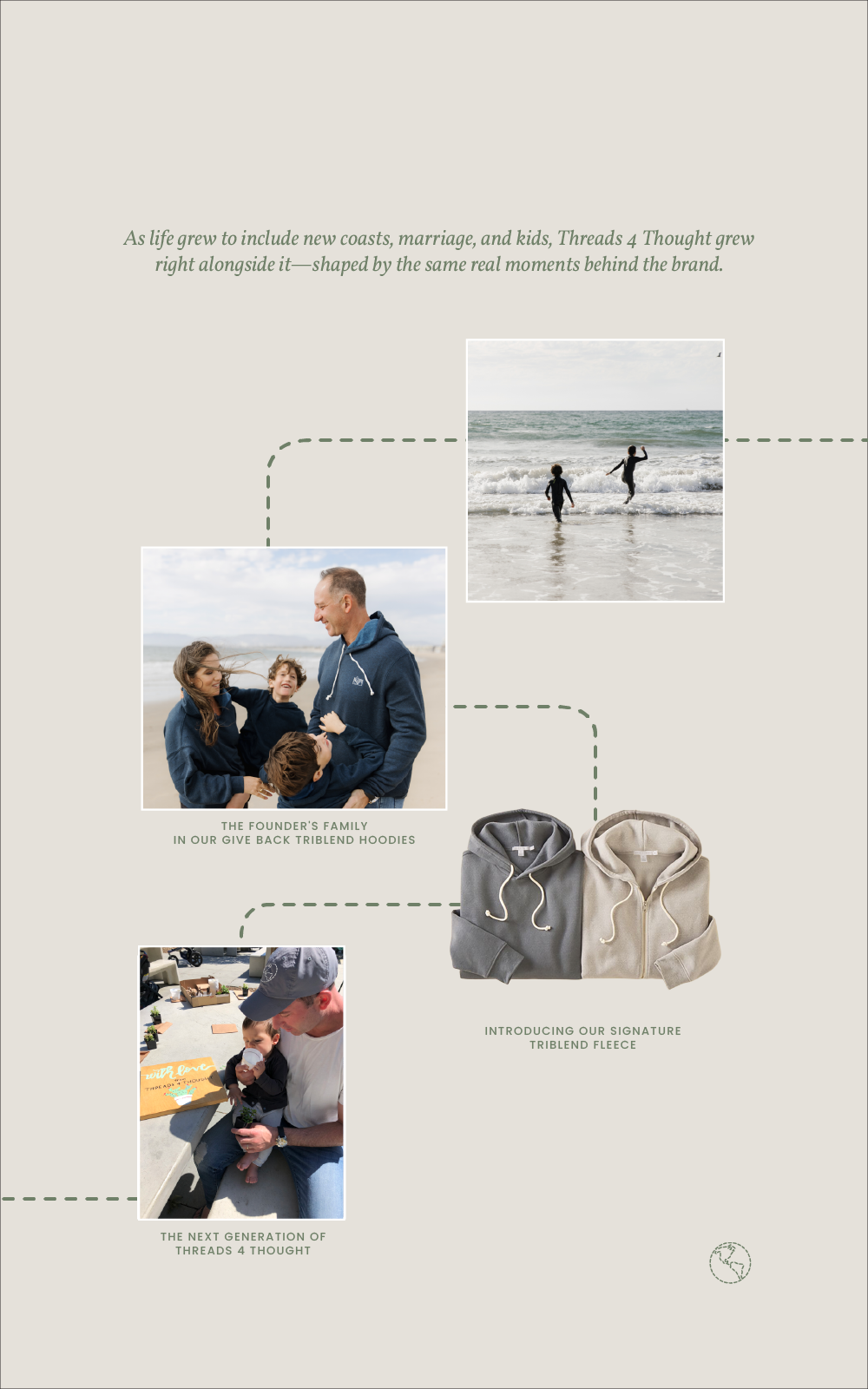 Threads 4 Thought began in New York City in 2006, when Leigh and Eric Fleet set out to build a more thoughtful kind of apparel company. What started as a small run of responsibly made graphic tees quickly found its way into everyday wardrobes — and onto unexpected stages. As life evolved, so did the brand. Marriage. Children. A move to California. A deeper connection to the natural world and a clearer commitment to protecting it. Partnerships with retailers like Whole Foods and Nordstrom expanded their reach, while the collections matured into what Threads 4 Thought is known for today: elevated comfort, effortless versatility, and timeless essentials designed for real life. Now based in California, Leigh and Eric lead the brand alongside their team—guided by trust, care, and shared responsibility.