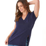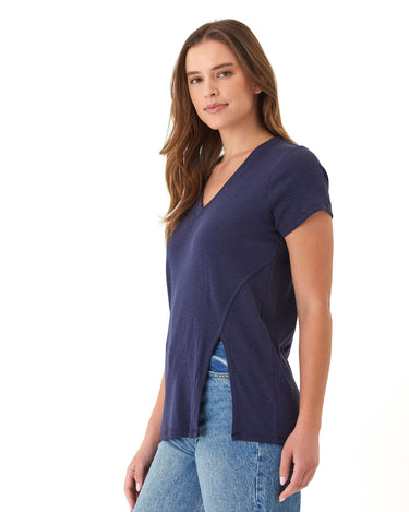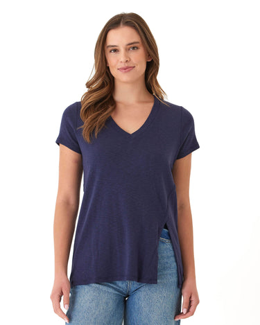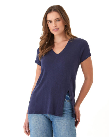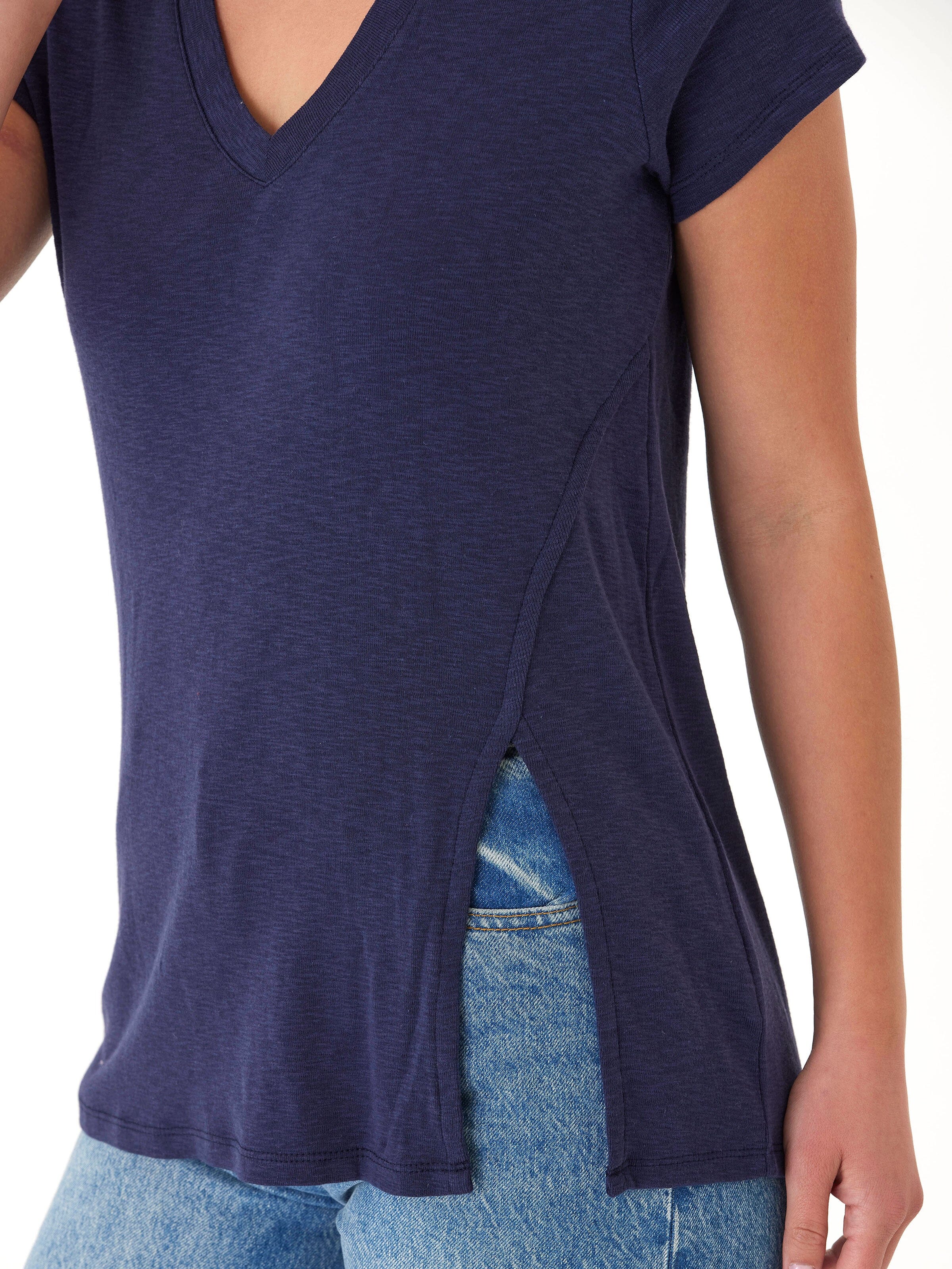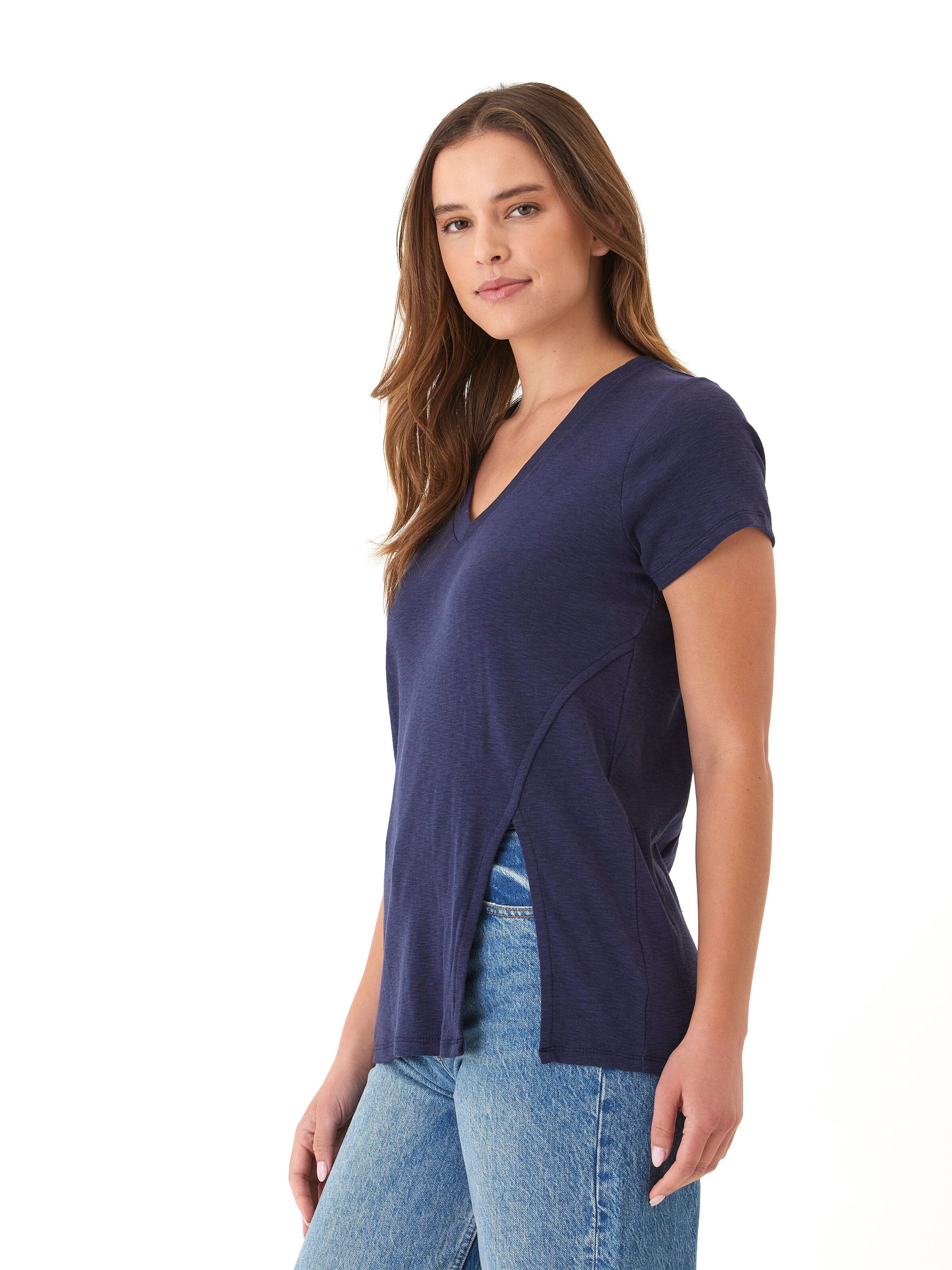 Lightweight, breathable, and effortlessly flattering. This slub jersey tee features a classic V-neck, relaxed fit, and side slit detail for easy movement and a modern touch. Perfectly draped and endlessly versatile—your everyday essential, upgraded.