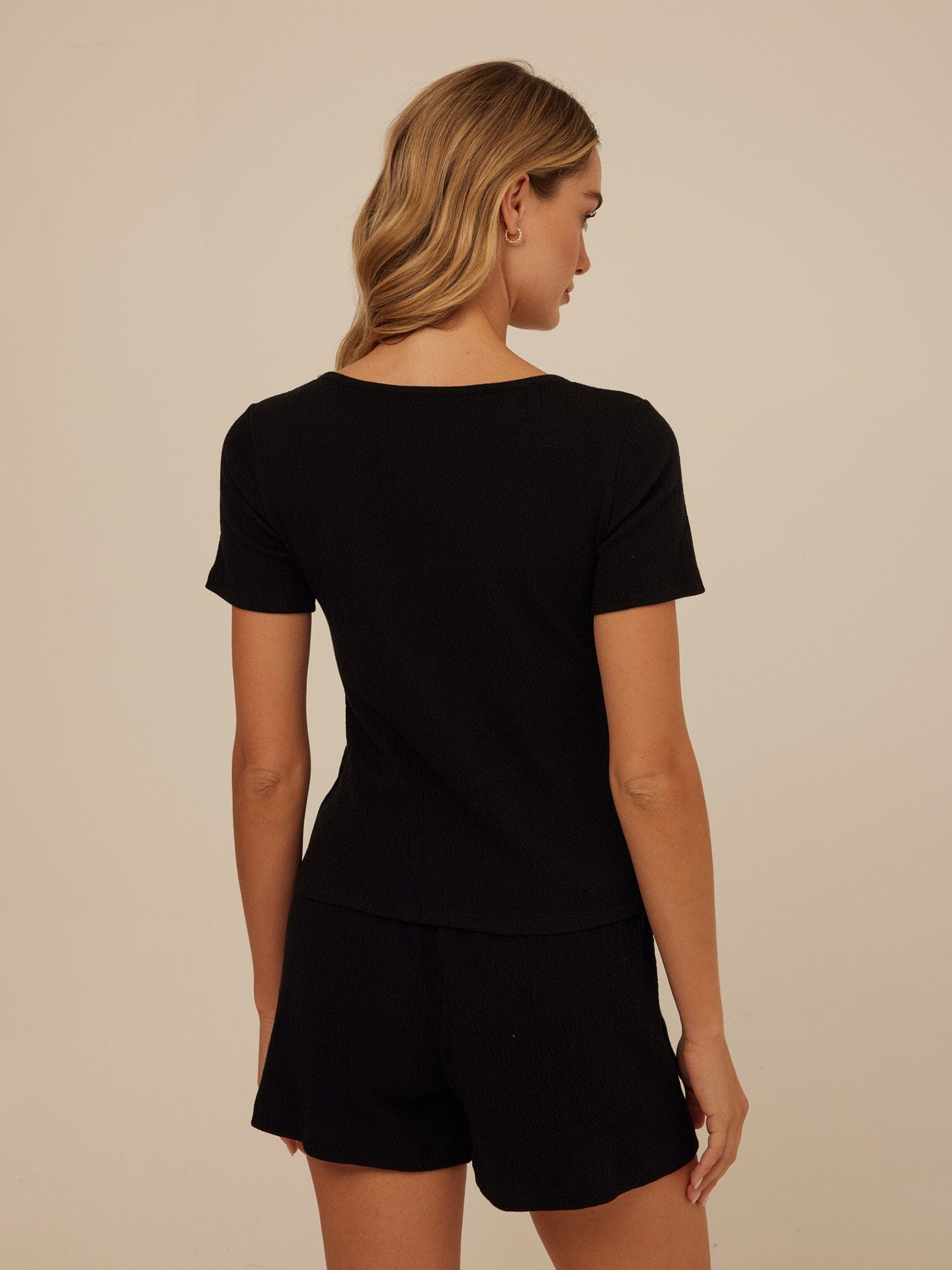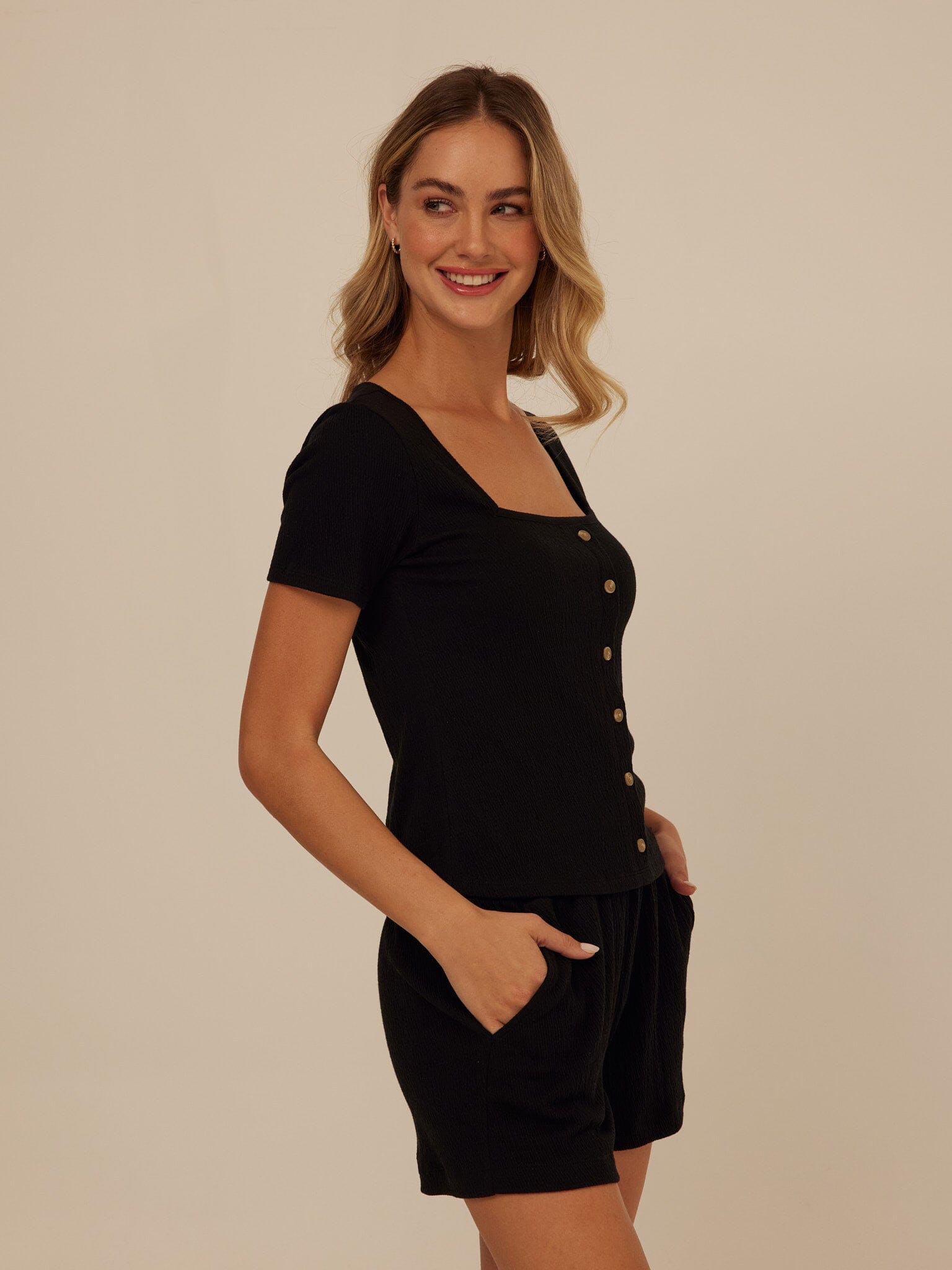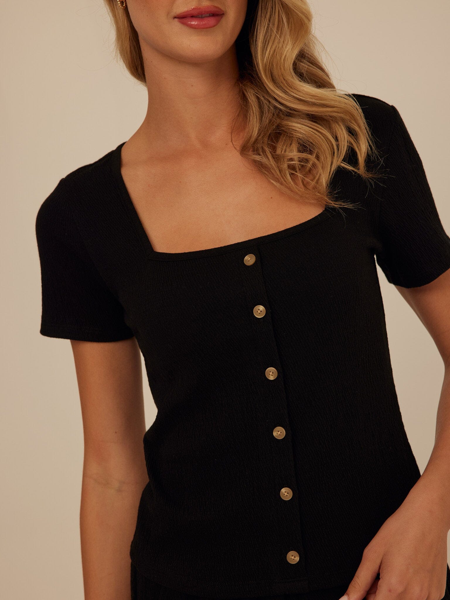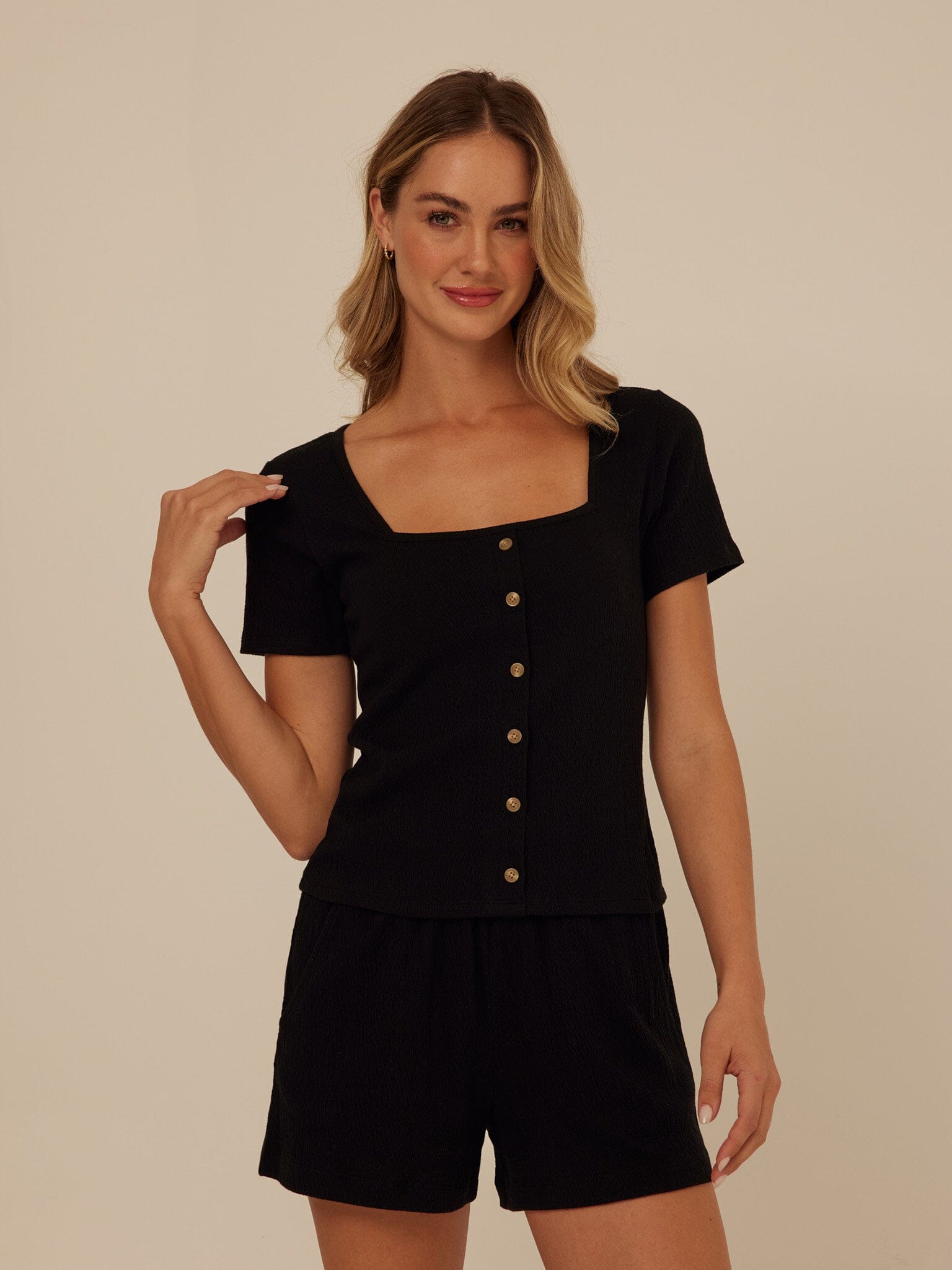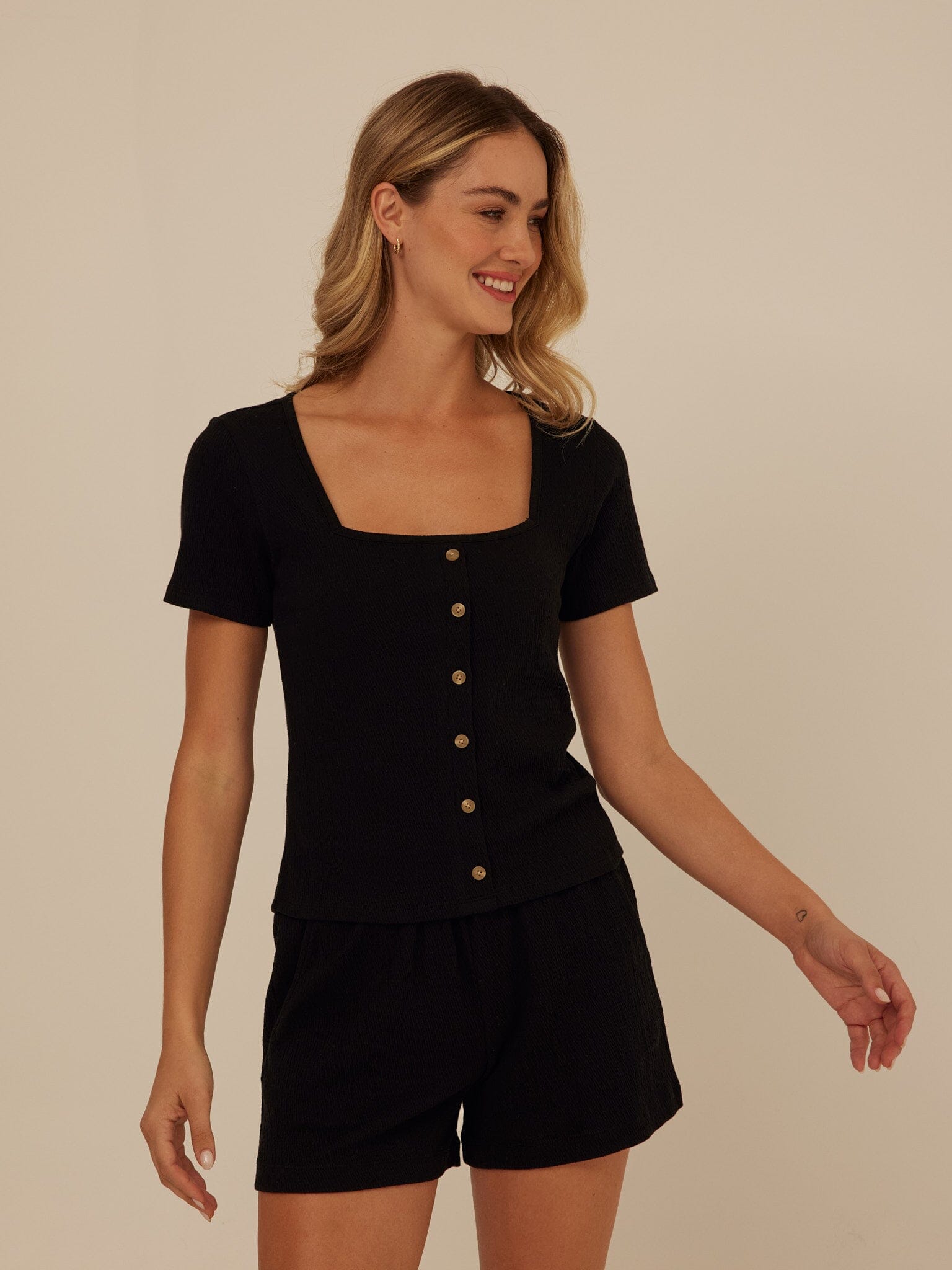 Soft structure meets everyday ease. Crafted from breathable smocked jersey with gentle stretch, this top offers a flattering, close-to-the-body fit that moves comfortably with you. A modern square neckline and natural button details add a refined, feminine finish.
