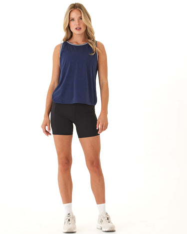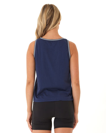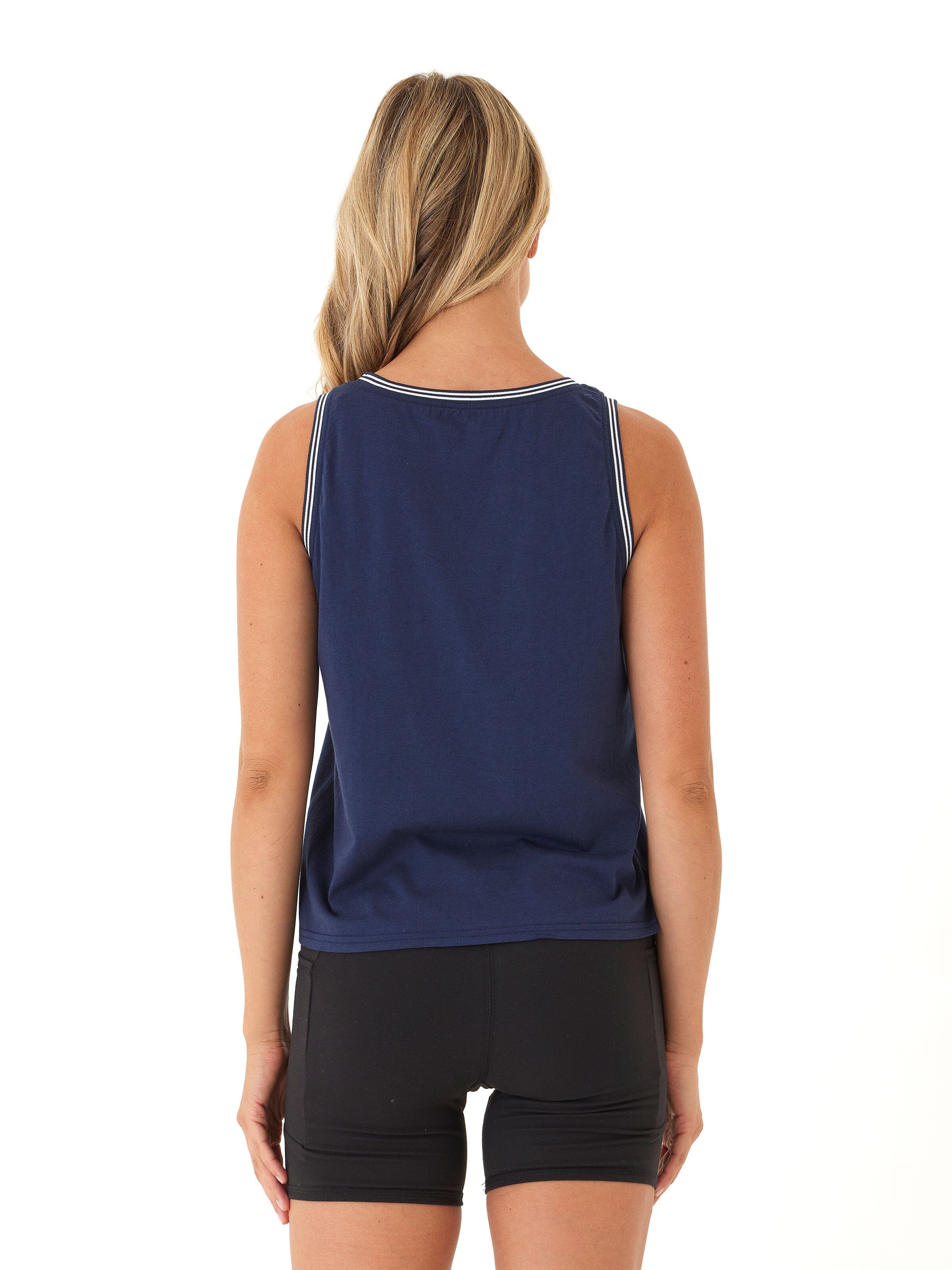 Sporty, simple, and effortlessly cool—this tank is made from our soft, breathable jersey for all-day comfort. Featuring contrast stripe trim at the neckline and armholes, it adds a subtle retro vibe to a classic silhouette. Perfect for pairing with bike shorts, denim, or layering post-workout.
