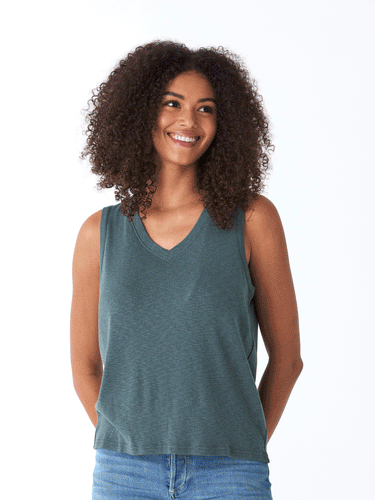 I love the color and feel of this tank top. The cut of the neckline and arms is very comfortable and allows for movement and air circulation when it's hot. I LOVE the tie detail in the back. It allows for the shirt to sit really nicely along with waistline and give shape.