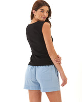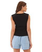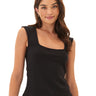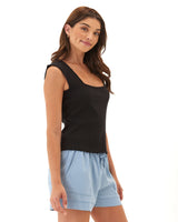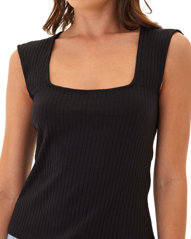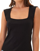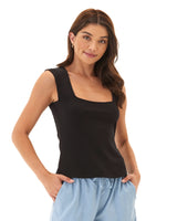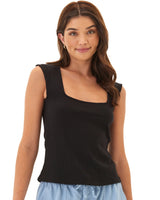 This ribbed knit tank features a modern square neckline and a flattering, body-skimming fit. Soft, stretchy, and easy to style, it’s a versatile staple for layering or wearing on its own.