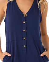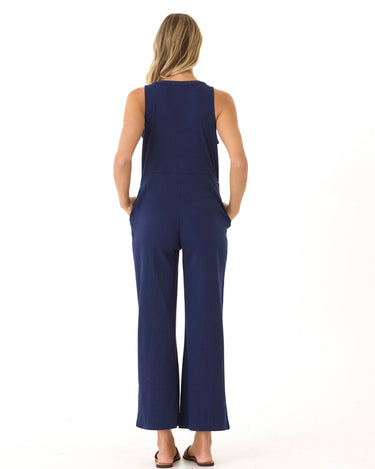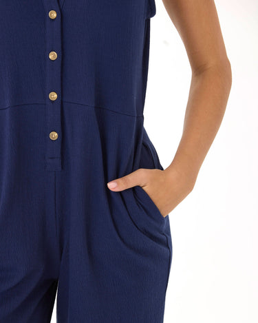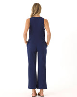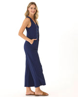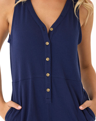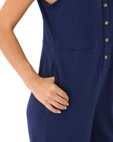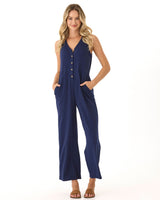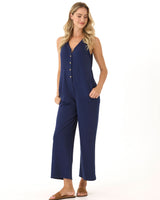 This sleeveless button-front jumpsuit is made from soft, textured fabric for a breathable, all-day comfortable feel. With its relaxed wide-leg fit and flattering V-neckline, it’s an effortless one-and-done look for warm weather days.