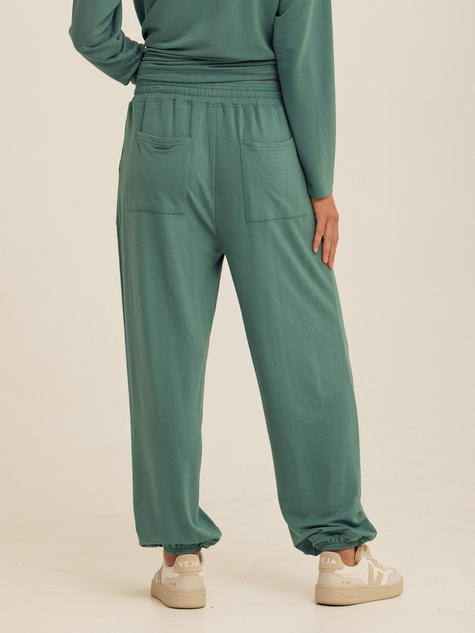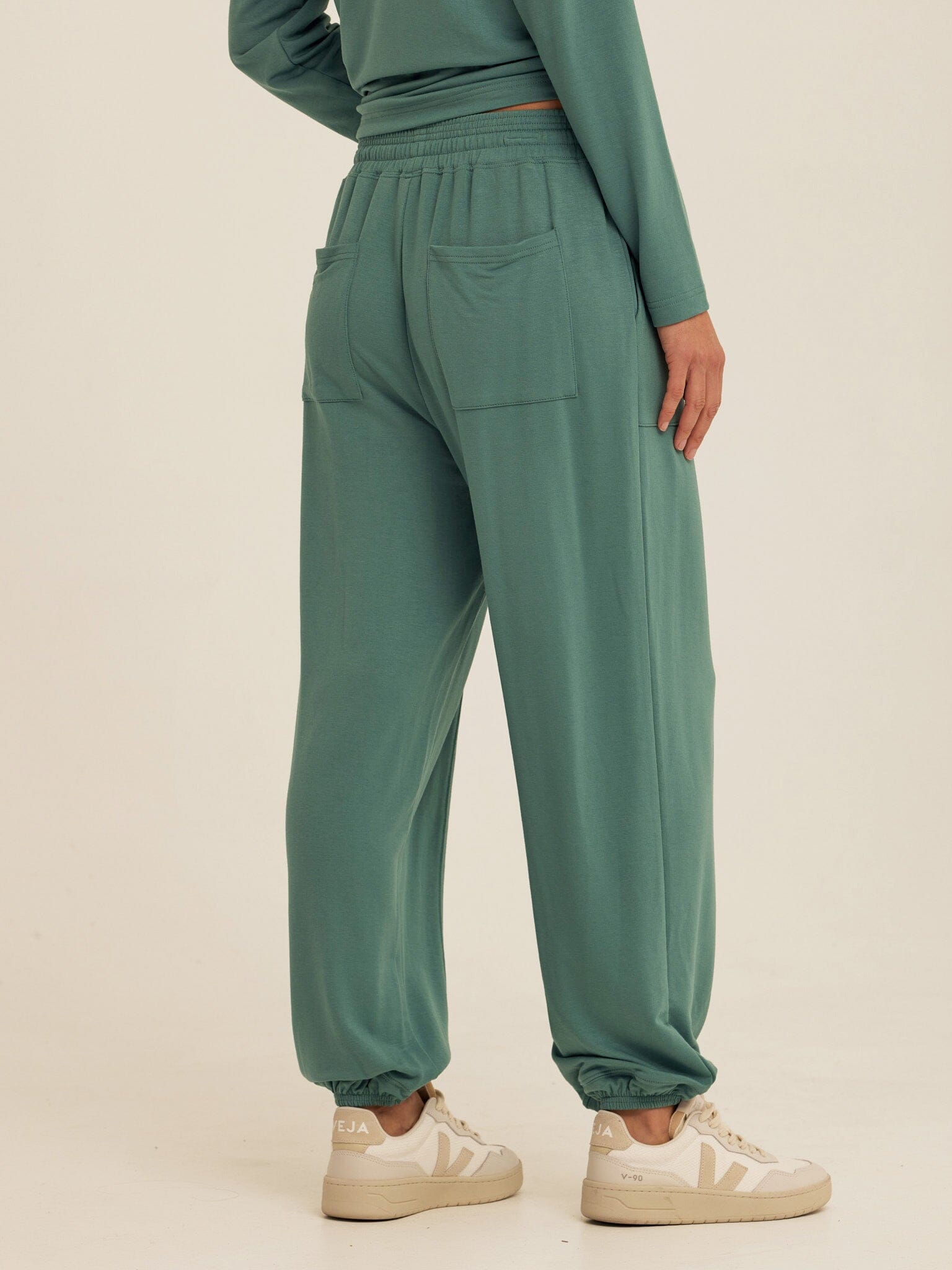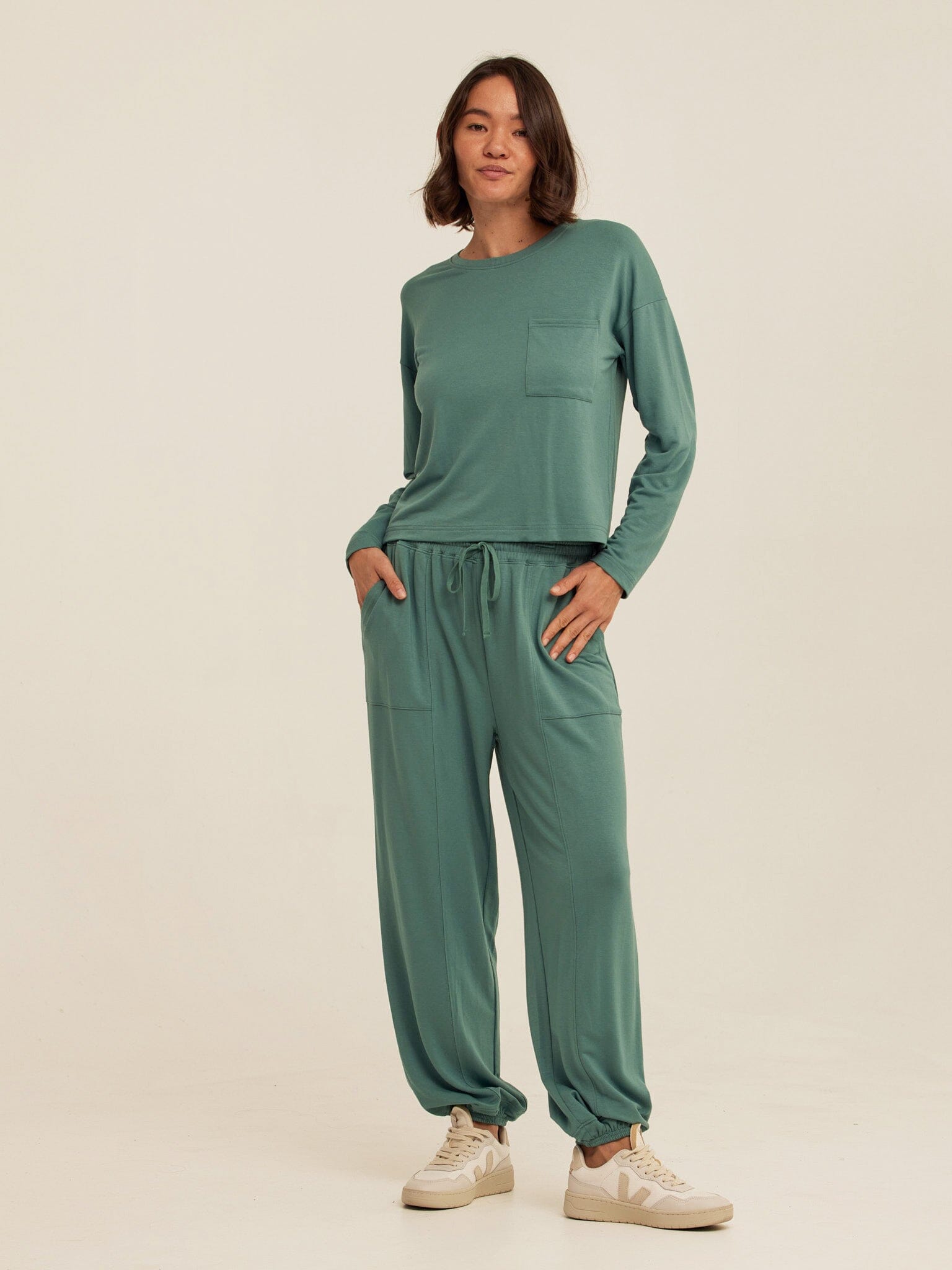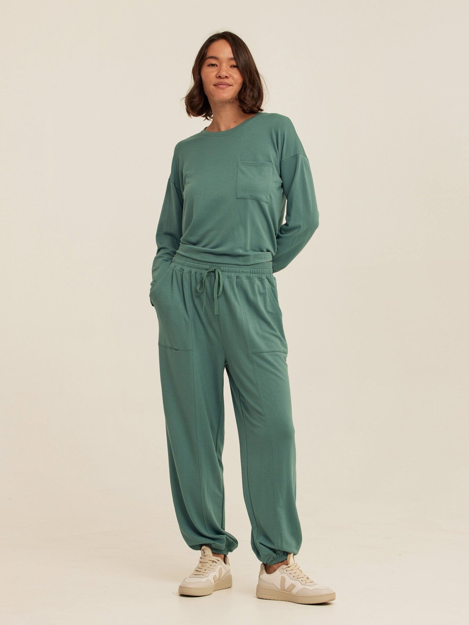 An easy jogger with a soft, drapey feel. The Lottie Modal Terry Jogger is made from smooth Modal Terry for lightweight comfort that moves with you. Designed with a relaxed fit, it features an elastic waistband with adjustable drawstring, side pockets, and elastic cuffs for a laid-back, everyday silhouette. Pair it with the matching Sylvie Oversized Pullover Hoodie for a coordinated set that’s perfect for lounging, travel days, and off-duty wear.