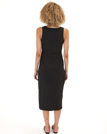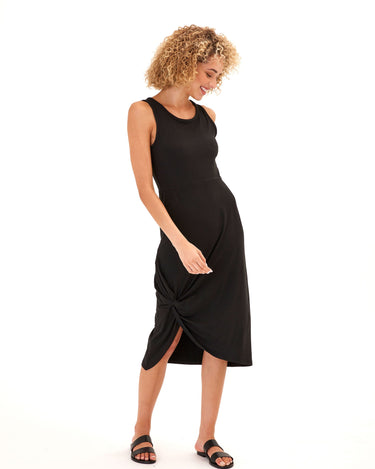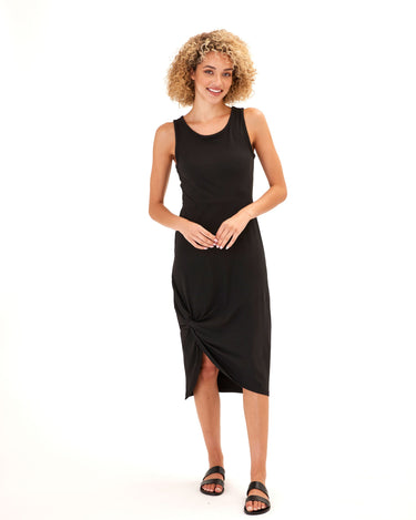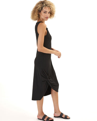 Experience luxurious comfort in our Lula Luxe Jersey Knotted Midi Dress. Made from a stretchy and breathable blend of recycled polyester and spandex, this dress offers a relaxed fit and features a flattering knotted detail. Perfect for any occasion, feel confident and stylish in this eco-friendly choice.