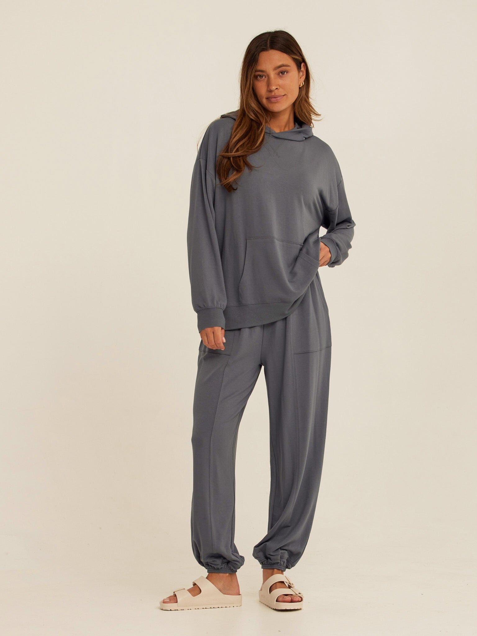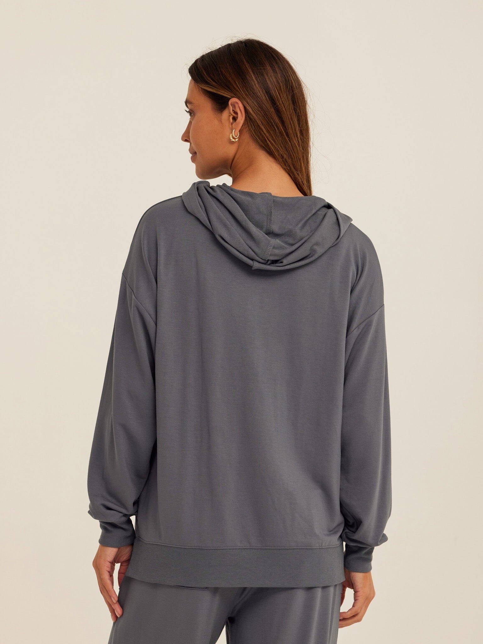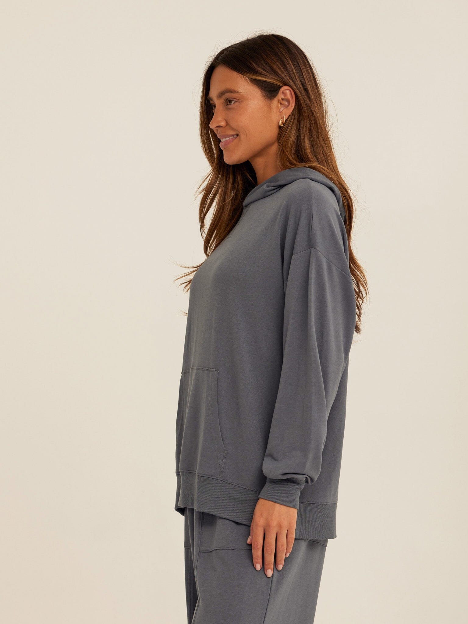 Soft, drapey, and easy to wear. The Sylvie Oversized Pullover Hoodie is crafted from smooth Modal Terry for a lightweight feel with an ultra-soft hand. Designed with an intentionally oversized fit, it features a relaxed hood, dropped shoulders, and a classic kangaroo pocket for everyday comfort. Pair it with the matching jogger for a coordinated set that works for lounging, layering, and life on the go.