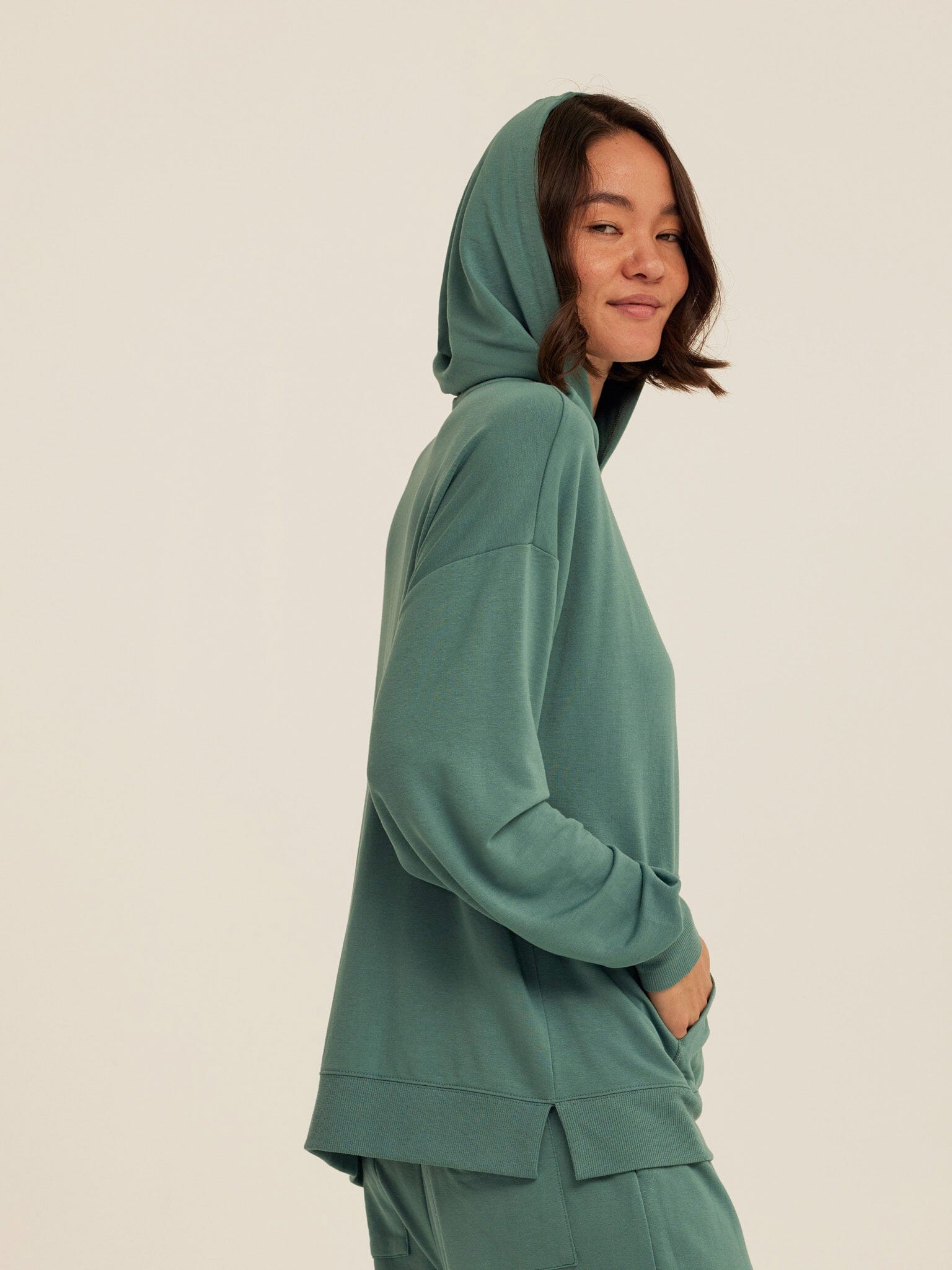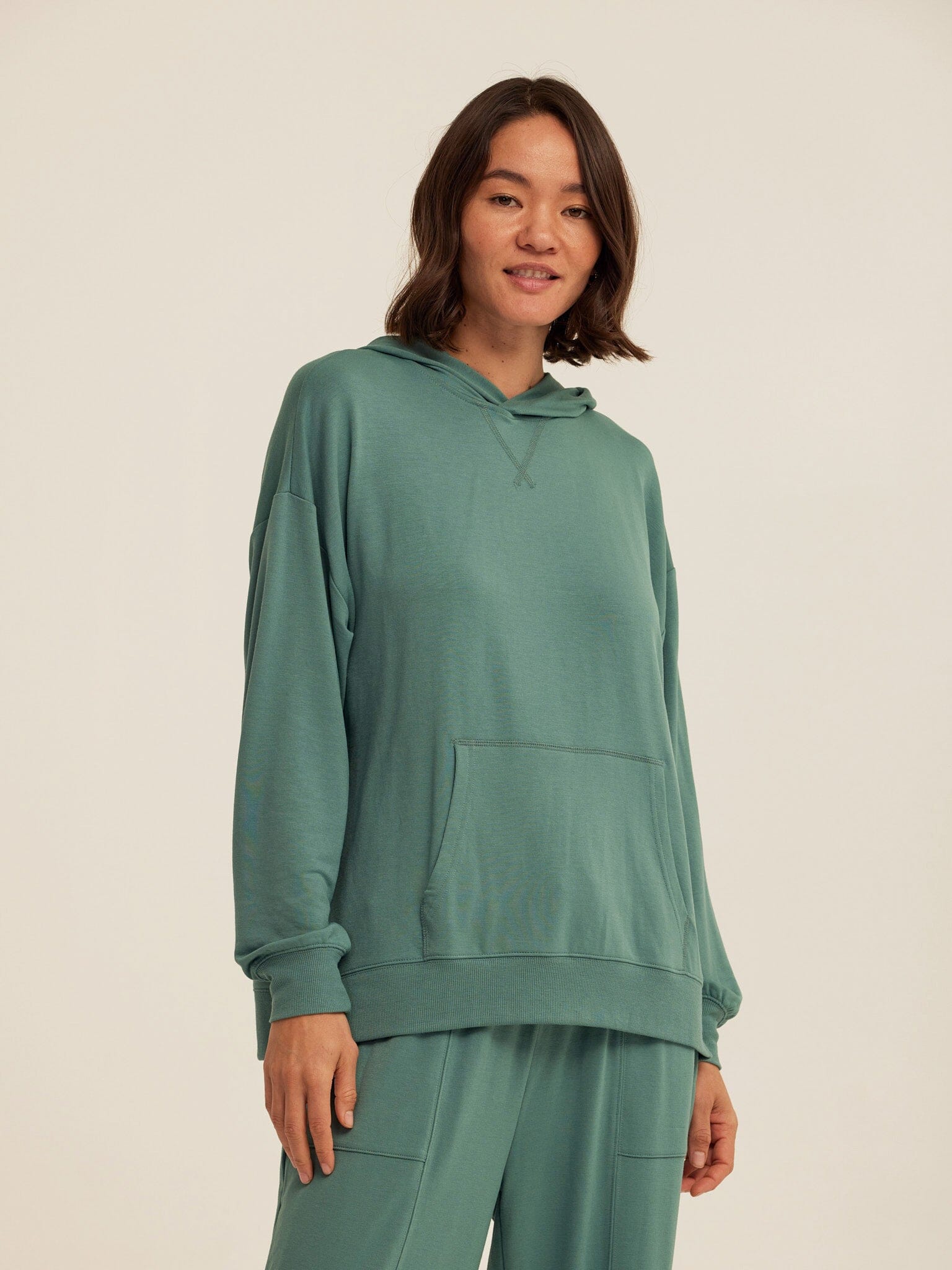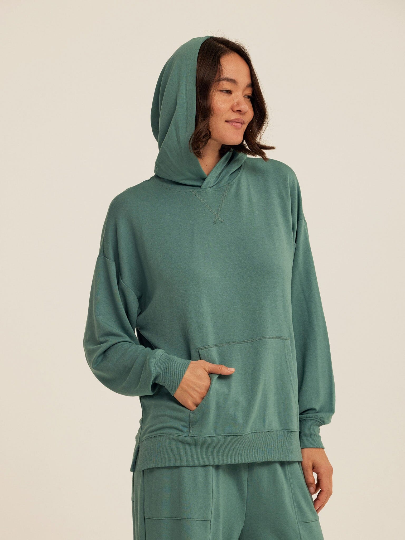 Soft, drapey, and easy to wear. The Sylvie Oversized Pullover Hoodie is crafted from smooth Modal Terry for a lightweight feel with an ultra-soft hand. Designed with an intentionally oversized fit, it features a relaxed hood, dropped shoulders, and a classic kangaroo pocket for everyday comfort. Pair it with the matching jogger for a coordinated set that works for lounging, layering, and life on the go.