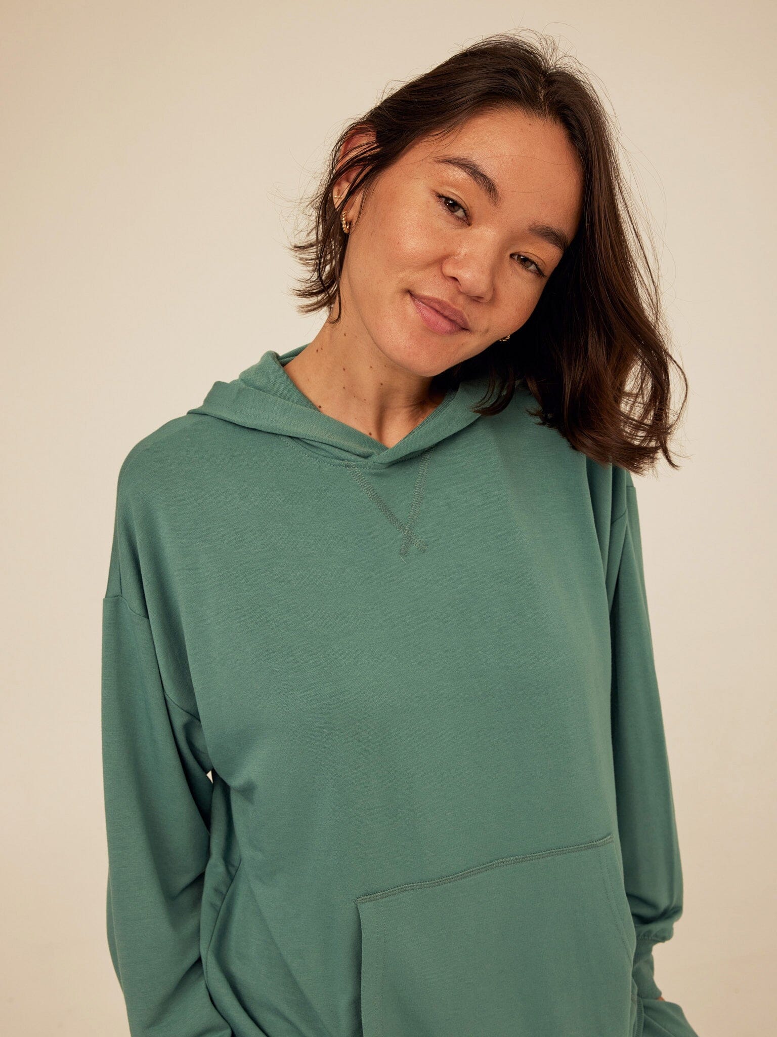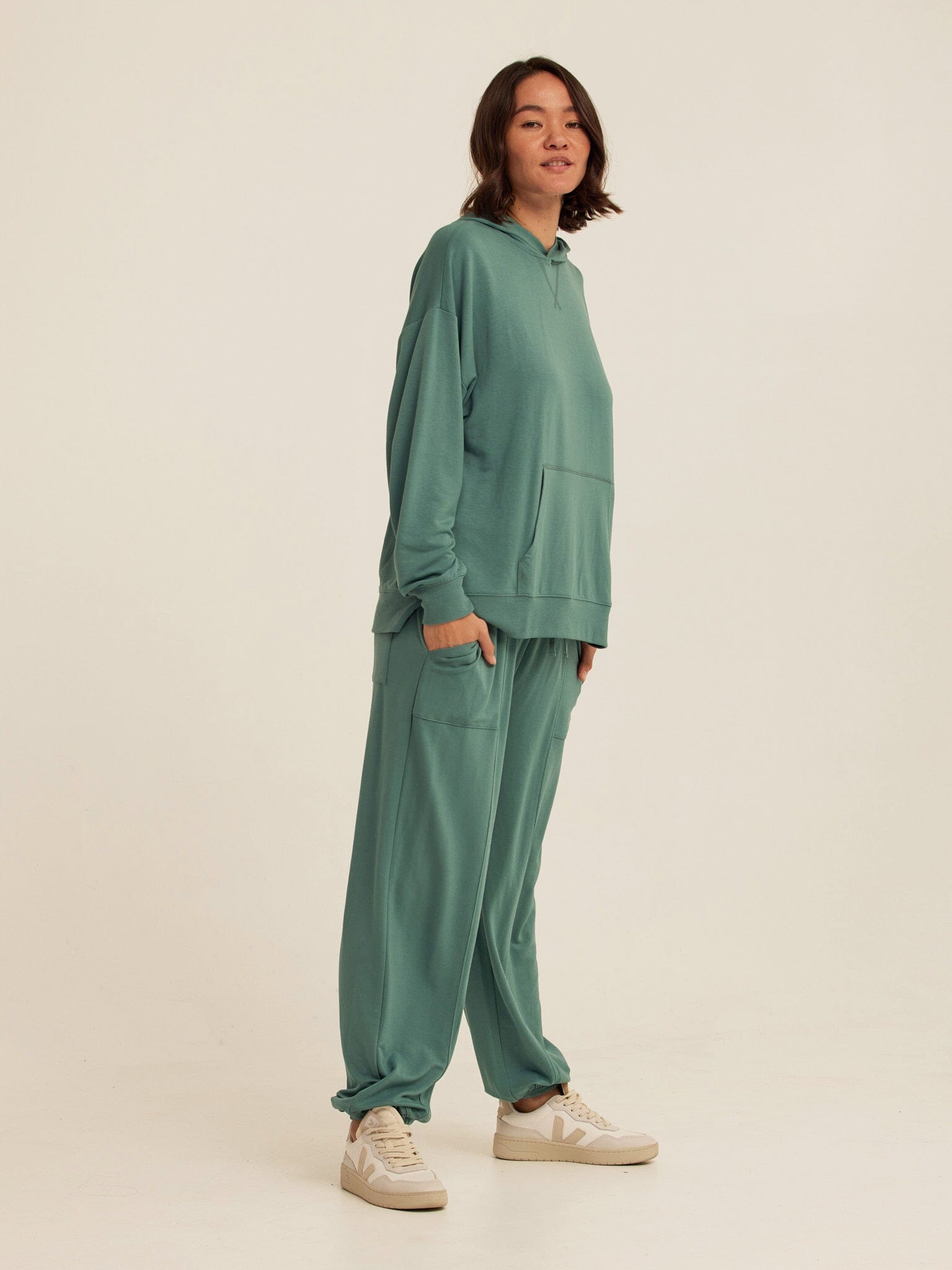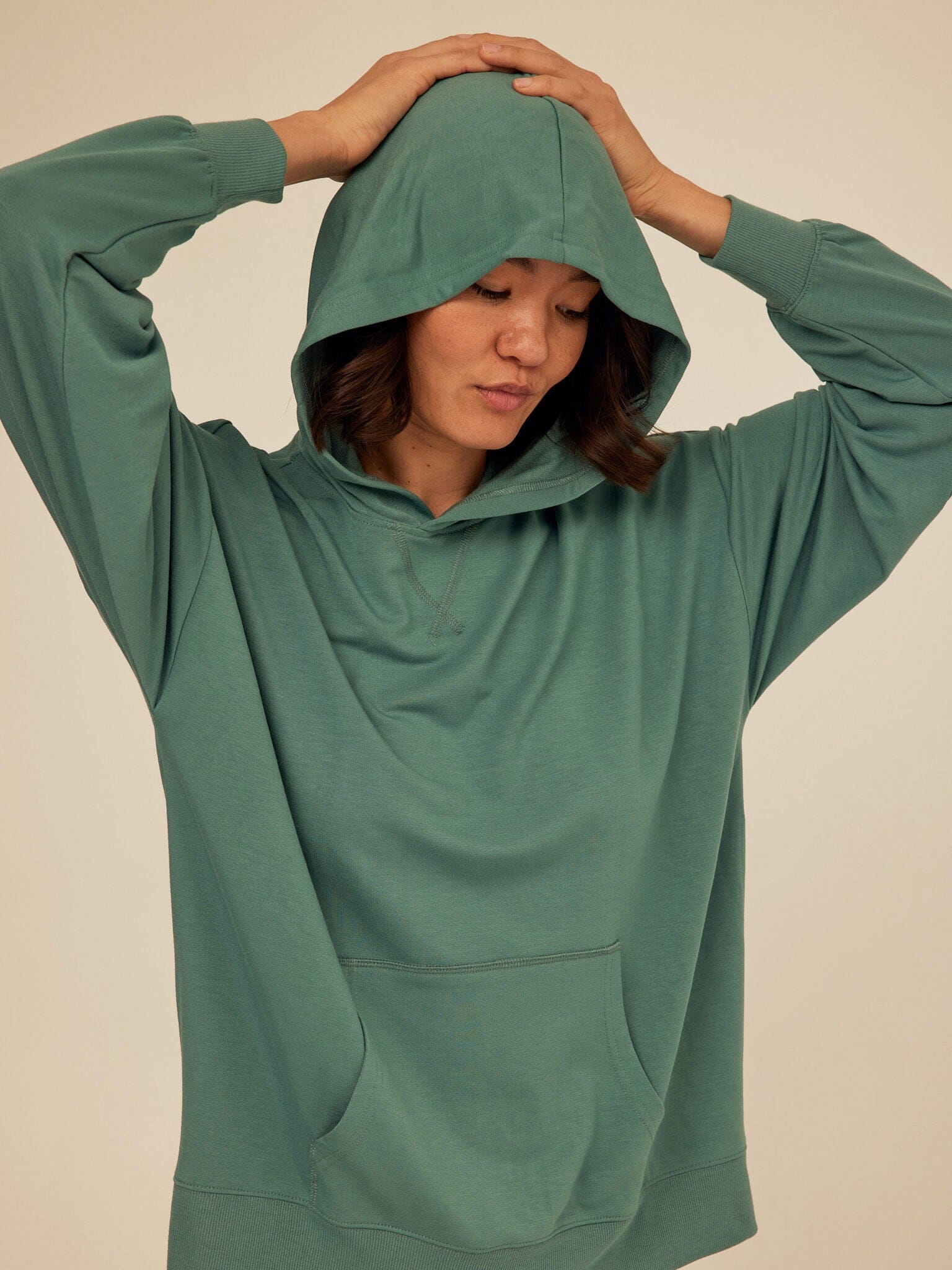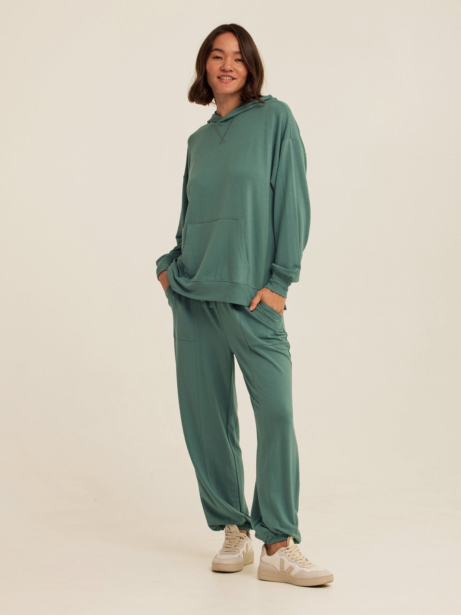 Soft, drapey, and easy to wear. The Sylvie Oversized Pullover Hoodie is crafted from smooth Modal Terry for a lightweight feel with an ultra-soft hand. Designed with an intentionally oversized fit, it features a relaxed hood, dropped shoulders, and a classic kangaroo pocket for everyday comfort. Pair it with the matching jogger for a coordinated set that works for lounging, layering, and life on the go.