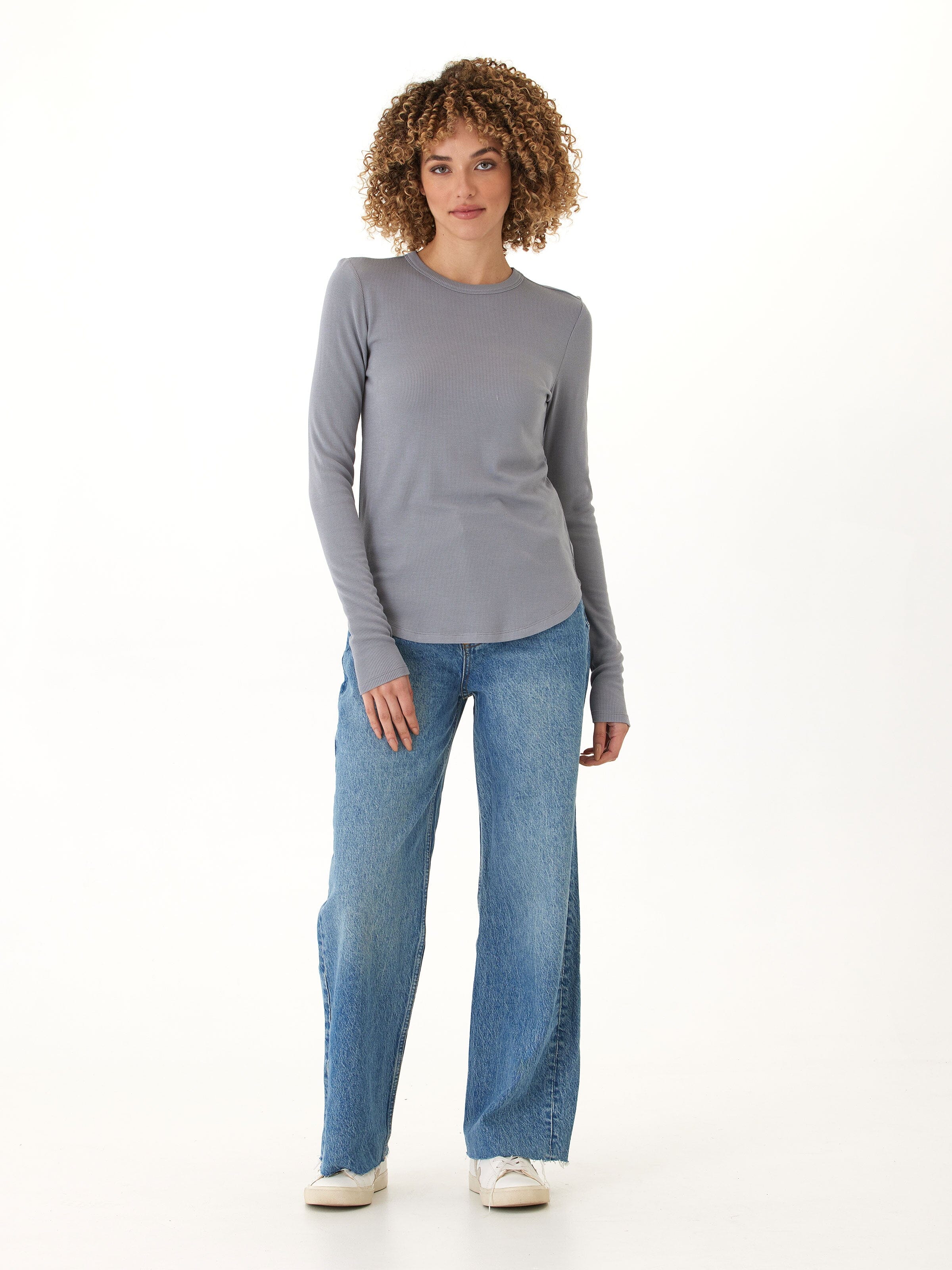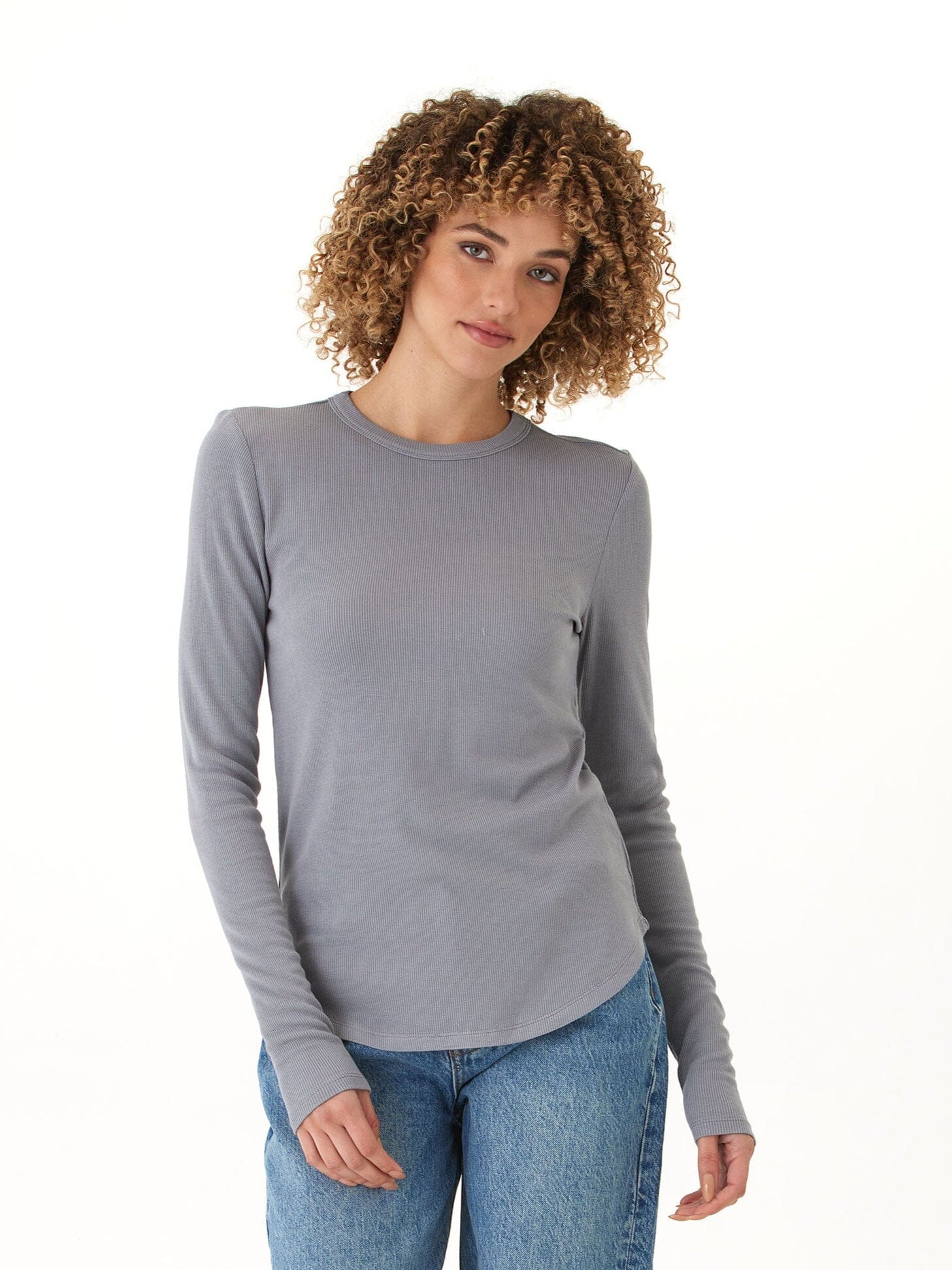 A timeless staple, reimagined in our ultra-soft Feather Rib fabric. This long sleeve tee offers a flattering, body-skimming fit with just the right amount of stretch for all-day comfort. The ribbed texture adds subtle dimension, while the curved hemline gives it an elevated, feminine finish. Perfect for layering or wearing solo, this top moves seamlessly from lounging at home to days on the go.