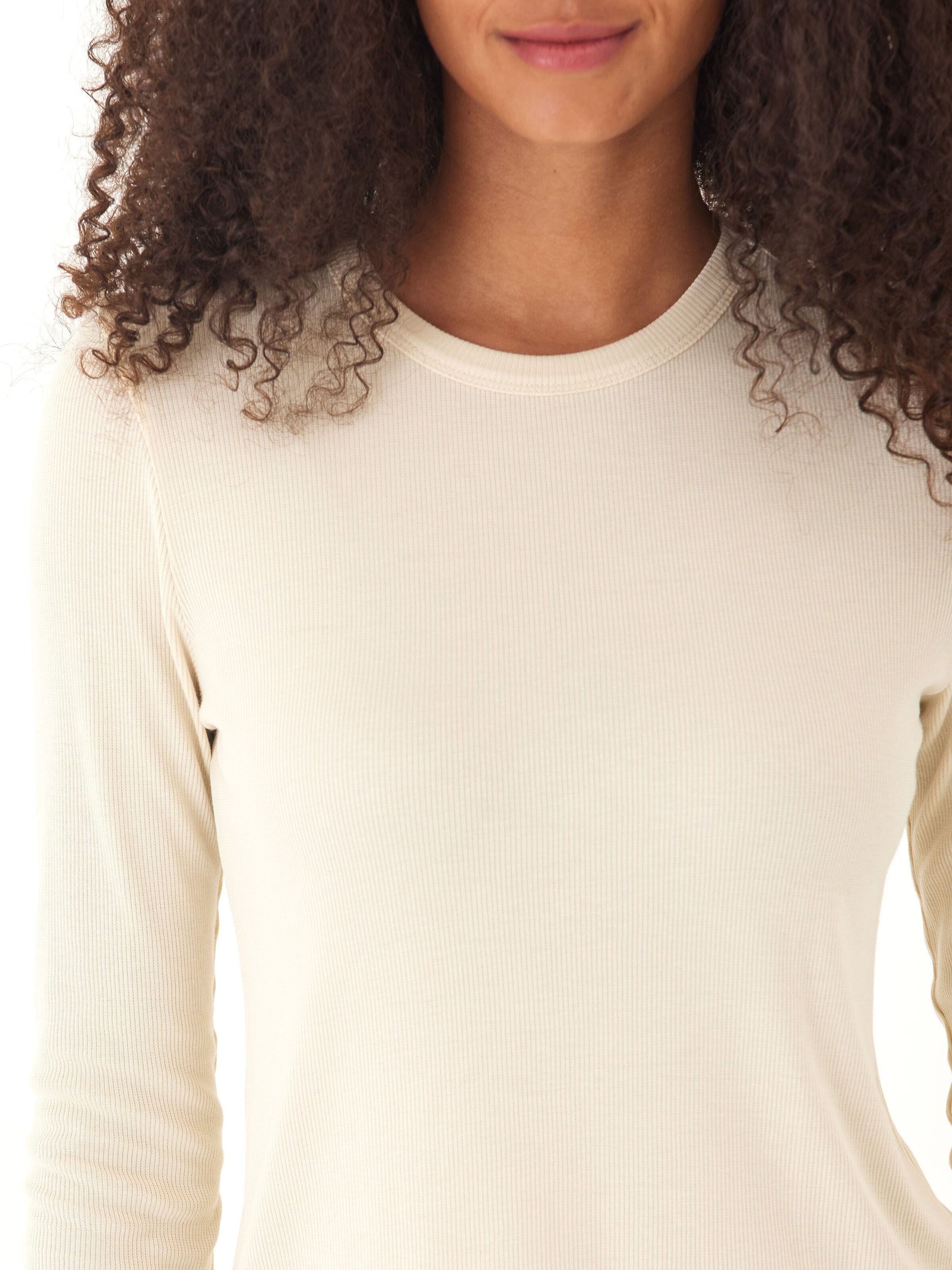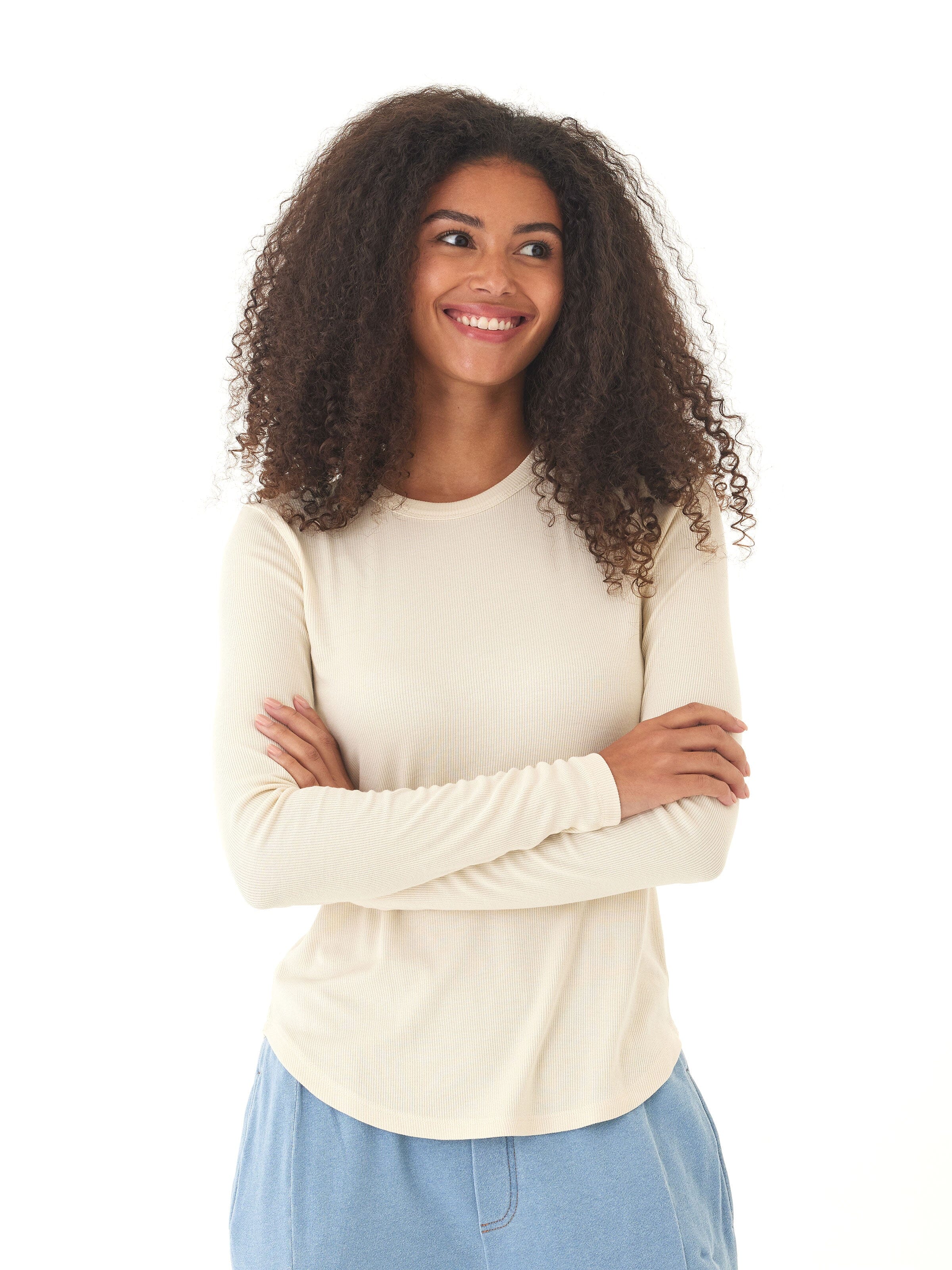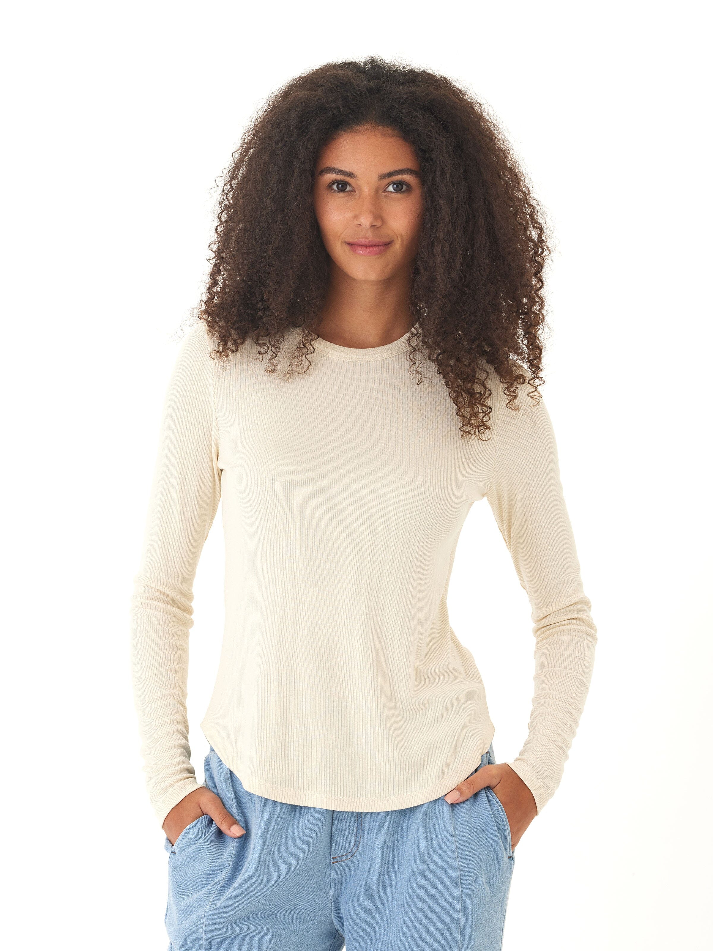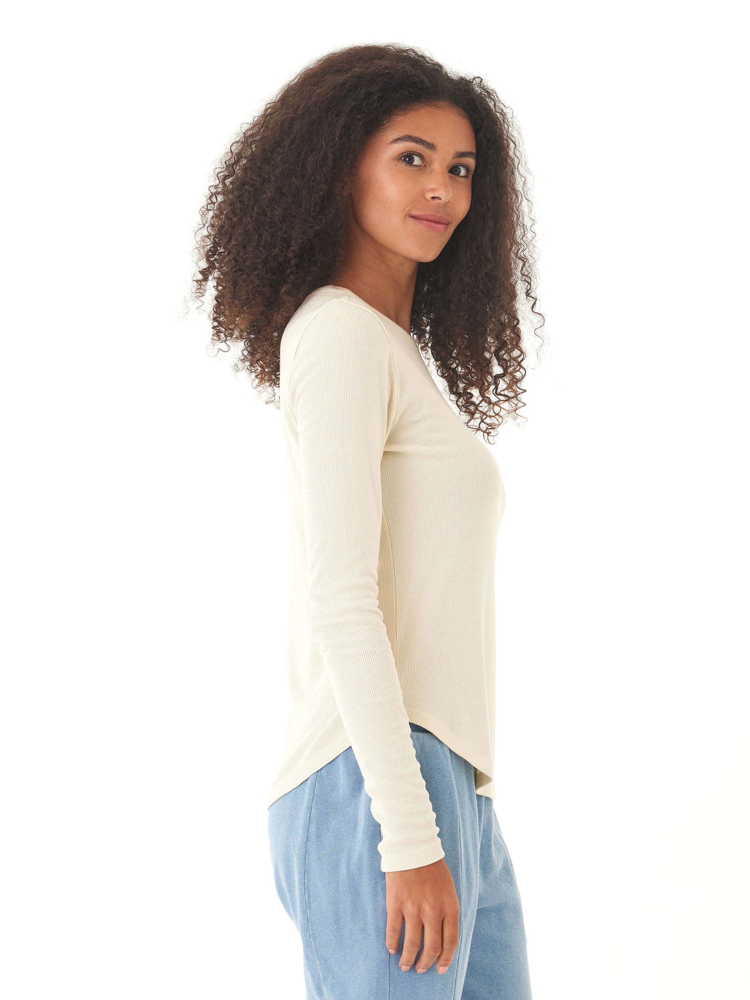 A timeless staple, reimagined in our ultra-soft Feather Rib fabric. This long sleeve tee offers a flattering, body-skimming fit with just the right amount of stretch for all-day comfort. The ribbed texture adds subtle dimension, while the curved hemline gives it an elevated, feminine finish. Perfect for layering or wearing solo, this top moves seamlessly from lounging at home to days on the go.